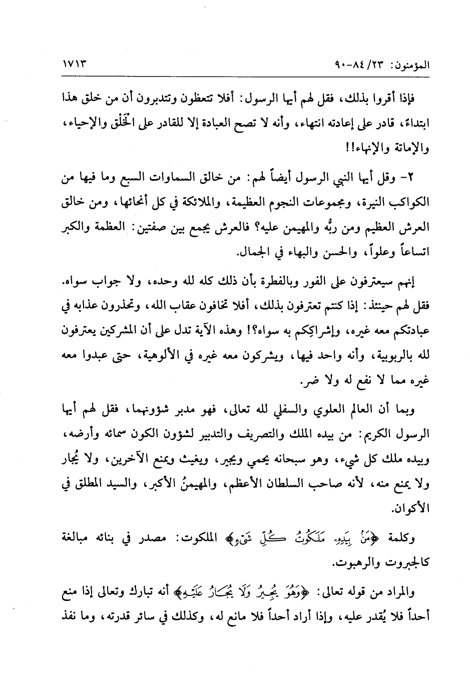 وكلمة مَنْ بِيَدِهِ مَلَكُوتُ كُلِّ شَيْءٍ الملكوت: مصدر في بنائه مبالغة كالجبروت والرهبوت.
