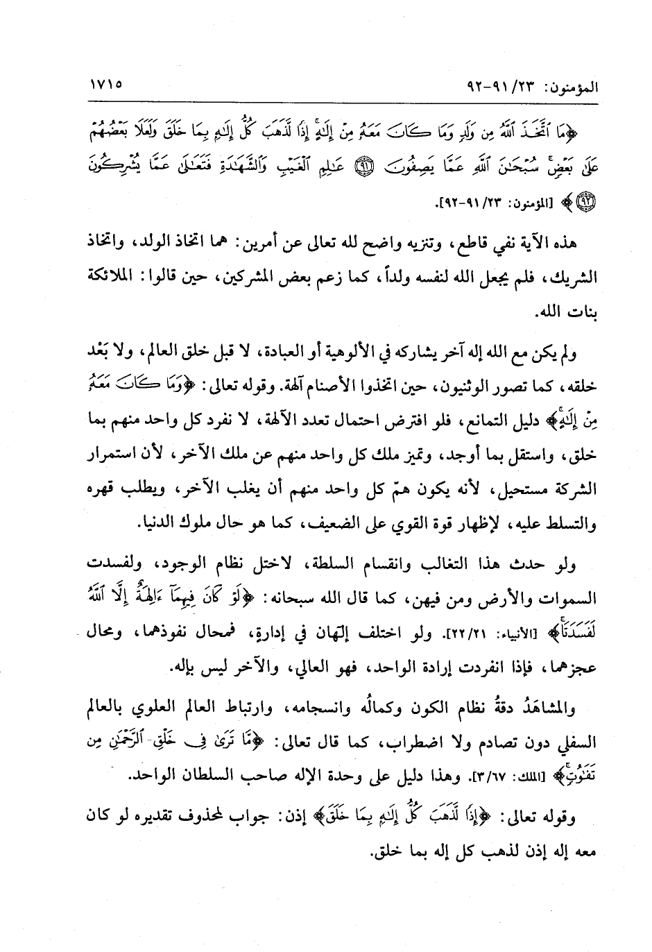 مَا اتَّخَذَ اللَّهُ مِنْ وَلَدٍ وَما كانَ مَعَهُ مِنْ إِلهٍ إِذاً لَذَهَبَ كُلُّ إِلهٍ بِما خَلَقَ وَلَعَلا بَعْضُهُمْ عَلى بَعْضٍ سُبْحانَ اللَّهِ عَمَّا يَصِفُونَ (91) عالِمِ الْغَيْبِ وَالشَّهادَةِ فَتَعالى عَمَّا يُشْرِكُونَ (92)