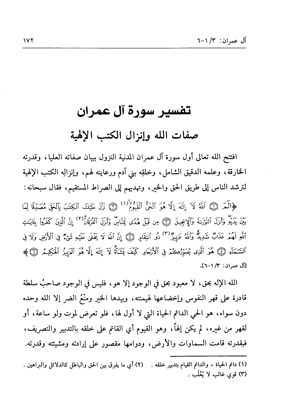 افتتح الله تعالى أول سورة آل عمران المدنية النزول ببيان صفاته العليا، وقدرته الخارقة، وعلمه الدقيق الشامل، وخلقه بني آدم ورعايته لهم، وإنزاله الكتب الإلهية لترشد الناس إلى طريق الحق والخير، وتهديهم إلى الصراط المستقيم، فقال سبحانه: