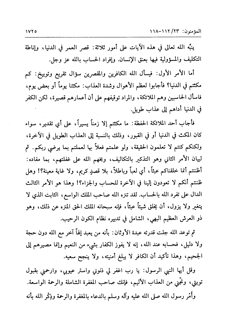 أظننتم أنما خلقناكم عبثا، أي لعبا وباطلا، بلا قصد كريم، ولا غاية معينة؟! وهل ظننتم أنكم لا تعودون إلينا في الآخرة للحساب والجزاء؟! وهذا هو الأمر الثالث الدال على تفرد الله بالحساب. لقد تنزه الله صاحب الملك الواسع، الثابت الذي لا يتغير ولا يزول، أن يخلق شيئا عبثا، فإنه سبحانه الملك الحق المنزه عن ذلك، وهو ذو العرش العظيم البهي، الشامل في تدبيره نظام الكون الرحيب.