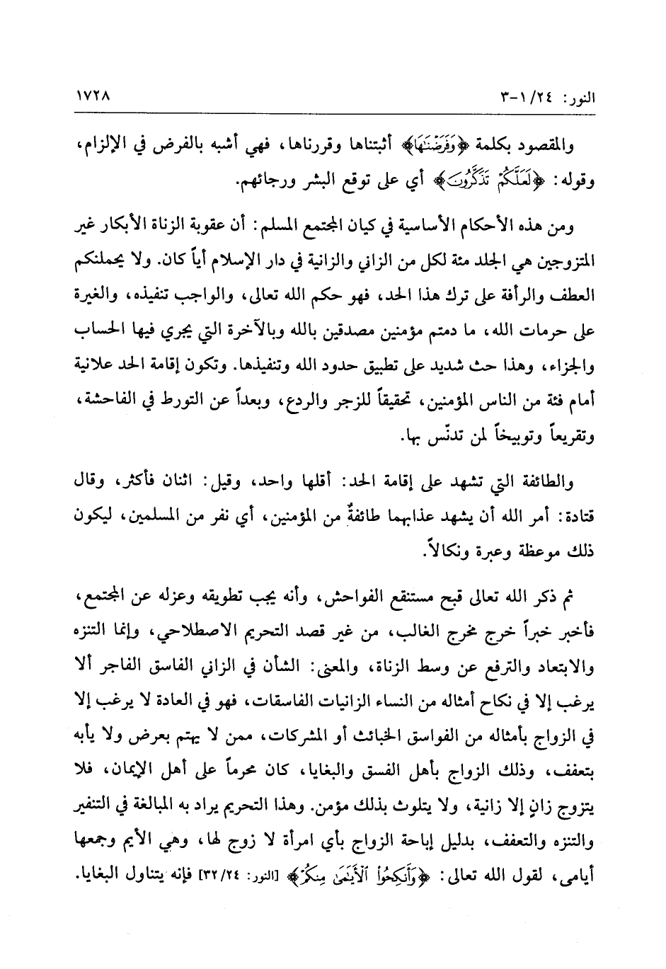 ومن هذه الأحكام الأساسية في كيان المجتمع المسلم: أن عقوبة الزناة الأبكار غير المتزوجين هي الجلد مائة لكل من الزاني والزانية في دار الإسلام أيا كان. ولا يحملنكم العطف والرأفة على ترك هذا الحد فهو حكم الله تعالى، والواجب تنفيذه، والغيرة على حرمات الله، ما دمتم مؤمنين مصدقين بالله وبالآخرة التي يجري فيها الحساب والجزاء، وهذا حث شديد على تطبيق حدود الله وتنفيذها. وتكون إقامة الحد علانية أمام فئة من الناس المؤمنين، تحقيقا للزجر والردع، وبعدا عن التورط في الفاحشة، وتقريعا وتوبيخا لمن تدنّس بها.