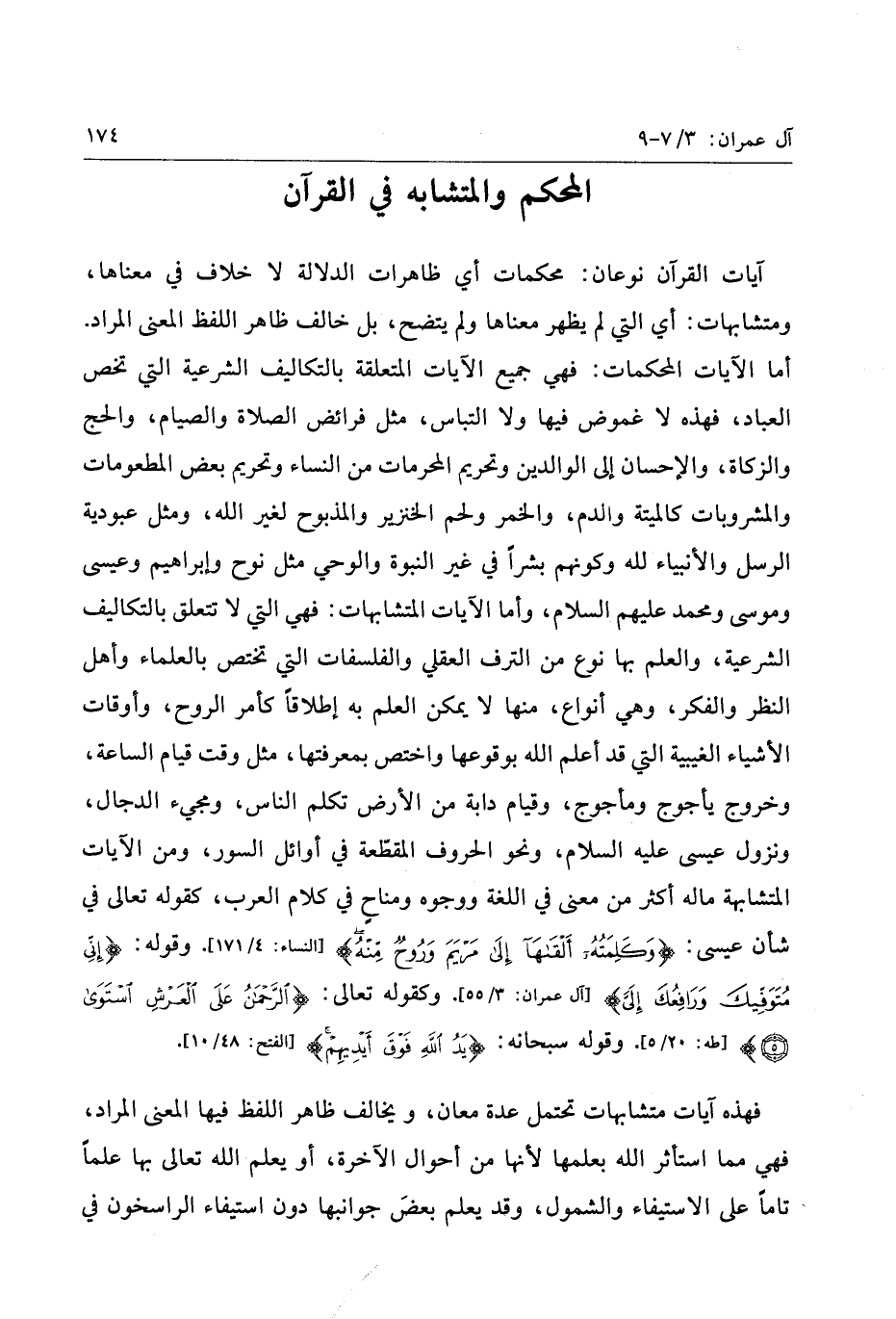 أما الآيات المحكمات: فهي جميع الآيات المتعلقة بالتكاليف الشرعية التي تخص العباد، فهذه لا غموض فيها ولا التباس، مثل فرائض الصلاة والصيام، والحج والزكاة، والإحسان إلى الوالدين وتحريم المحرمات من النساء وتحريم بعض المطعومات والمشروبات كالميتة والدم، والخمر ولحم الخنزير والمذبوح لغير الله، ومثل عبودية الرسل والأنبياء لله وكونهم بشرا في غير النبوة والوحي مثل نوح وإبراهيم وعيسى وموسى ومحمد عليهم السلام، وأما الآيات المتشابهات: فهي التي لا تتعلق بالتكاليف الشرعية، والعلم بها نوع من الترف العقلي والفلسفات التي تختص بالعلماء وأهل النظر والفكر، وهي أنواع، منها لا يمكن العلم به إطلاقا كأمر الروح، وأوقات الأشياء الغيبية التي قد أعلم الله بوقوعها واختص بمعرفتها، مثل وقت قيام الساعة، وخروج يأجوج ومأجوج، وقيام دابة من الأرض تكلم الناس، ومجيء الدجال، ونزول عيسى عليه السلام، ونحو الحروف المقطّعة في أوائل السور، ومن الآيات المتشابهة ماله أكثر من معنى في اللغة ووجوه ومناح في كلام العرب، كقوله تعالى في شأن عيسى: وَكَلِمَتُهُ أَلْقاها إِلى مَرْيَمَ وَرُوحٌ مِنْهُ [النساء: 4/ 171] . وقوله: إِنِّي مُتَوَفِّيكَ وَرافِعُكَ إِلَيَّ [آل عمران: 3/ 55] . وكقوله تعالى: الرَّحْمنُ عَلَى الْعَرْشِ اسْتَوى (5) [طه: 20/ 5] . وقوله سبحانه: يَدُ اللَّهِ فَوْقَ أَيْدِيهِمْ [الفتح: 48/ 10] .