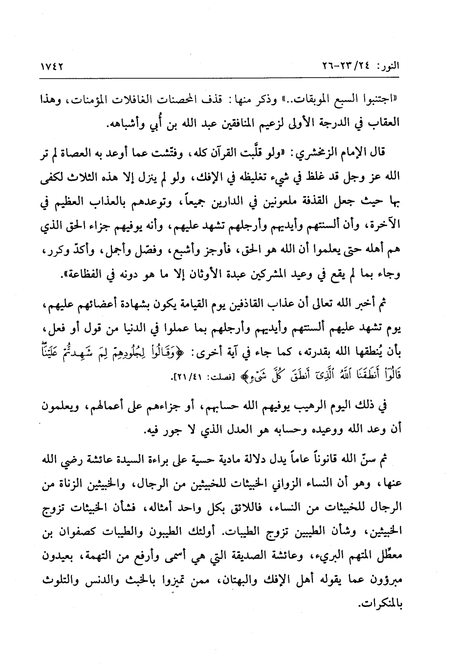 قال الإمام الزمخشري: «ولو قلّبت القرآن كله، وفتّشت عما أوعد به العصاة لم تر الله عز وجل قد غلظ في شيء تغليظه في الإفك، ولو لم ينزل إلا هذه الثلاث لكفى بها حيث جعل القذفة ملعونين في الدارين جميعا، وتوعدهم بالعذاب العظيم في الآخرة، وأن ألسنتهم وأيديهم وأرجلهم تشهد عليهم، وأنه يوفيهم جزاء الحق الذي هم أهله حتى يعلموا أن الله هو الحق، فأوجز وأشبع، وفصّل وأجمل، وأكدّ وكرر، وجاء بما لم يقع في وعيد المشركين عبدة الأوثان إلا ما هو دونه في الفظاعة» .