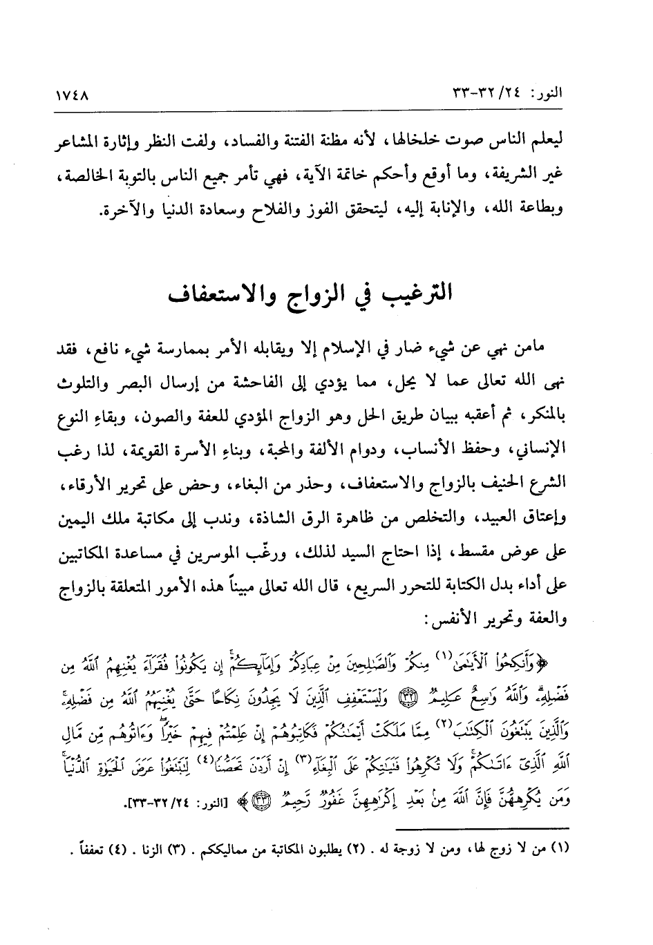 ما من نهي عن شيء ضار في الإسلام إلا ويقابله الأمر بممارسة شيء نافع، فقد نهى الله تعالى عما لا يحل، مما يؤدي إلى الفاحشة من إرسال البصر والتلوث بالمنكر، ثم أعقبه ببيان طريق الحل وهو الزواج المؤدي للعفة والصون، وبقاء النوع الإنساني، وحفظ الأنساب، ودوام الألفة والمحبة، وبناء الأسرة القويمة، لذا رغب الشرع الحنيف بالزواج والاستعفاف، وحذر من البغاء، وحض على تحرير الأرقاء، وإعتاق العبيد، والتخلص من ظاهرة الرق الشاذة، وندب إلى مكاتبة ملك اليمين على عوض مقسط، إذا احتاج السيد لذلك، ورغّب الموسرين في مساعدة المكاتبين على أداء بدل الكتابة للتحرر السريع، قال الله تعالى مبينا هذه الأمور المتعلقة بالزواج والعفة وتحرير الأنفس: