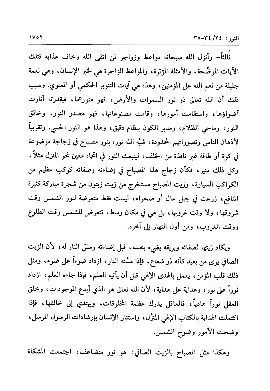 ثالثا- وأنزل الله سبحانه مواعظ وزواجر لمن اتقى الله وخاف عذابه فتلك الآيات الموضّحة، والأمثلة المؤثرة، والمواعظ الزاجرة هي لخير الإنسان، وهي نعمة جليلة من نعم الله على المؤمنين، وهذه هي آيات التنوير الحكمي أو المعنوي. وسبب ذلك أن الله تعالى ذو نور السموات والأرض، فهو منورهما، فبقدرته أنارت أضواؤها، واستقامت أمورها، وقامت مصنوعاتها، فهو مصدر النور، وخالق النور، وماحي الظلام، ومدبر الكون بنظام دقيق، وهذا هو النور الحسي. وتقريبا لأذهان الناس وتصوراتهم المحدودة، شبّه الله نوره بنور مصباح في زجاجة موضوعة في كوة أو طاقة غير نافذة من الخلف، لينبعث النور في اتجاه معين نحو المنزل مثلا، وكل ذلك منير، فكأن زجاج هذا المصباح في إضاءته وصفائه كوكب عظيم من الكواكب السيارة، وزيت المصباح مستخرج من زيت زيتون من شجرة مباركة كثيرة المنافع، زرعت في جبل عال أو صحراء، ليست فقط متعرضة لنور الشمس وقت شروقها، ولا وقت غروبها، بل هي في مكان وسط، تتعرض للشمس وقت الطلوع ووقت الغروب، ومن أول النهار إلى آخره.