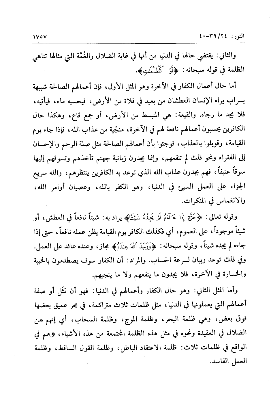 وأما المثل الثاني: وهو حال الكفار وأعمالهم في الدنيا: فهو أن مثل أو صفة أعمالهم التي يعملونها في الدنيا، مثل ظلمات ثلاث متراكمة، في بحر عميق بعضها فوق بعض، وهي ظلمة البحر، وظلمة الموج، وظلمة السحاب، أي إنهم من الضلال في العقيدة ونحوه في مثل هذه الظلمة المجتمعة من هذه الأشياء، وهم في الواقع في ظلمات ثلاث: ظلمة الاعتقاد الباطل، وظلمة القول الساقط، وظلمة العمل الفاسد.