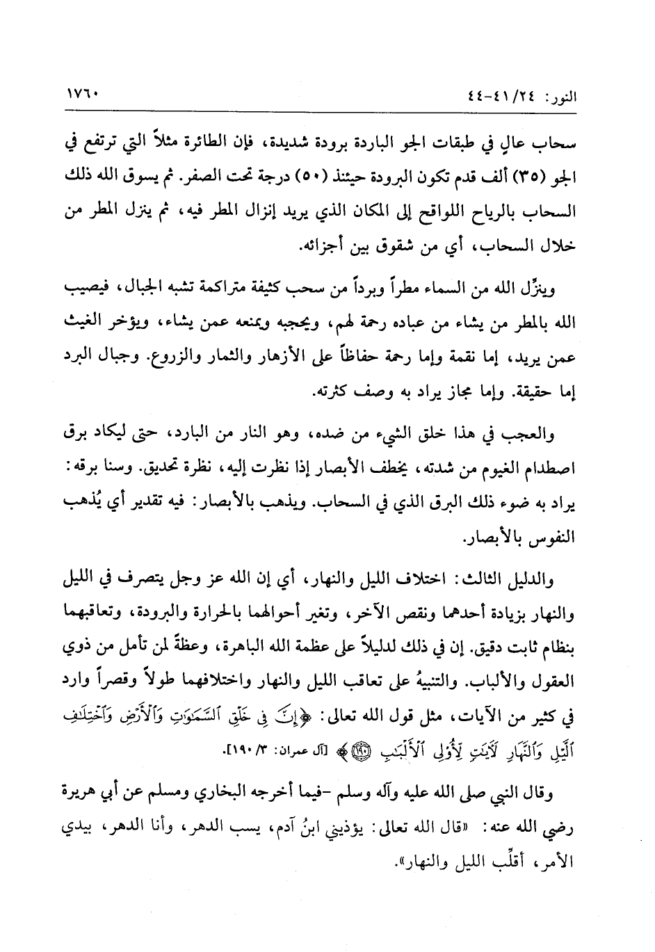 وينزّل الله من السماء مطرا وبردا من سحب كثيفة متراكمة تشبه الجبال، فيصيب الله بالمطر من يشاء من عباده رحمة لهم، ويحجبه ويمنعه عمن يشاء، ويؤخر الغيث عمن يريد، إما نقمة وإما رحمة حفاظا على الأزهار والثمار والزروع. وجبال البرد إما حقيقة. وإما مجاز يراد به وصف كثرته.