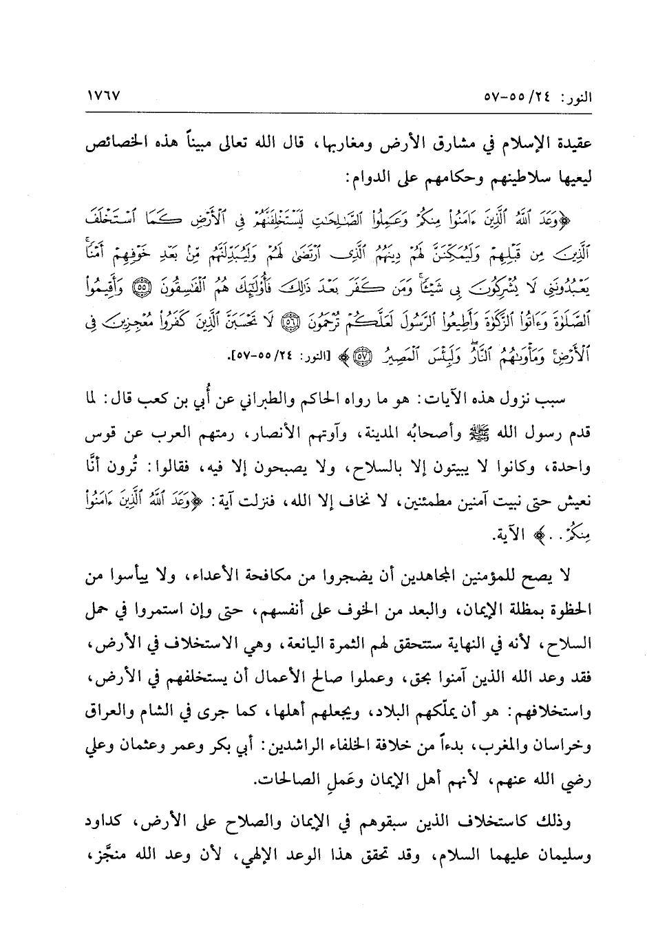 وَعَدَ اللَّهُ الَّذِينَ آمَنُوا مِنْكُمْ وَعَمِلُوا الصَّالِحاتِ لَيَسْتَخْلِفَنَّهُمْ فِي الْأَرْضِ كَمَا اسْتَخْلَفَ الَّذِينَ مِنْ قَبْلِهِمْ وَلَيُمَكِّنَنَّ لَهُمْ دِينَهُمُ الَّذِي ارْتَضى لَهُمْ وَلَيُبَدِّلَنَّهُمْ مِنْ بَعْدِ خَوْفِهِمْ أَمْناً يَعْبُدُونَنِي لا يُشْرِكُونَ بِي شَيْئاً وَمَنْ كَفَرَ بَعْدَ ذلِكَ فَأُولئِكَ هُمُ الْفاسِقُونَ (55) وَأَقِيمُوا الصَّلاةَ وَآتُوا الزَّكاةَ وَأَطِيعُوا الرَّسُولَ لَعَلَّكُمْ تُرْحَمُونَ (56) لا تَحْسَبَنَّ الَّذِينَ كَفَرُوا مُعْجِزِينَ فِي الْأَرْضِ وَمَأْواهُمُ النَّارُ وَلَبِئْسَ الْمَصِيرُ (57)