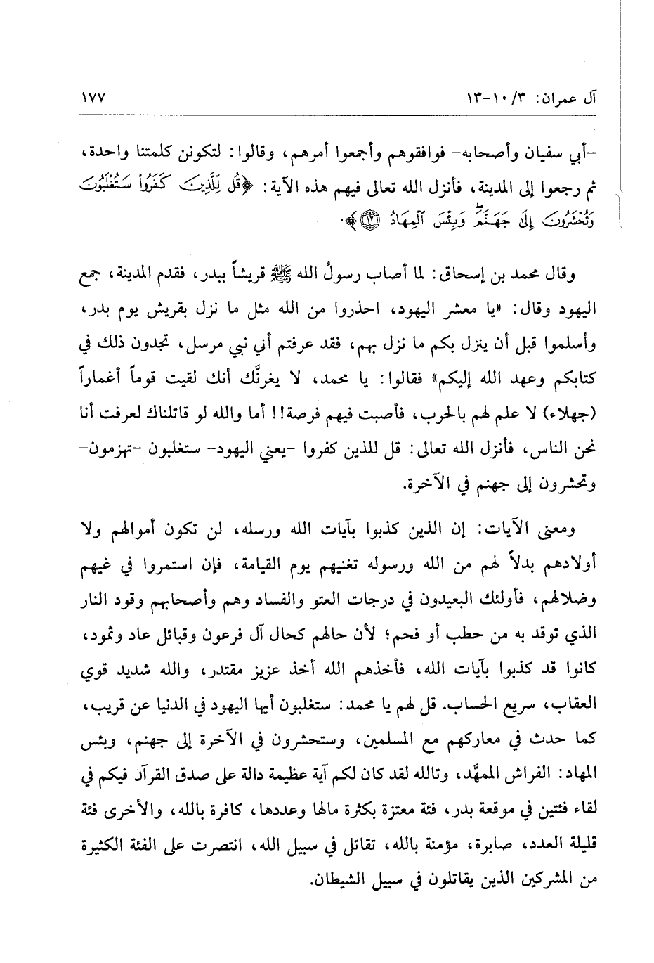 ومعنى الآيات: إن الذين كذبوا بآيات الله ورسله، لن تكون أموالهم ولا أولادهم بدلا لهم من الله ورسوله تغنيهم يوم القيامة، فإن استمروا في غيهم وضلالهم، فأولئك البعيدون في درجات العتو والفساد وهم وأصحابهم وقود النار الذي توقد به من حطب أو فحم لأن حالهم كحال آل فرعون وقبائل عاد وثمود، كانوا قد كذبوا بآيات الله، فأخذهم الله أخذ عزيز مقتدر، والله شديد قوي العقاب، سريع الحساب. قل لهم يا محمد: ستغلبون أيها اليهود في الدنيا عن قريب، كما حدث في معاركهم مع المسلمين، وستحشرون في الآخرة إلى جهنم، وبئس المهاد: الفراش الممهّد، وتالله لقد كان لكم آية عظيمة دالة على صدق القرآن فيكم في لقاء فئتين في موقعة بدر، فئة معتزة بكثرة مالها وعددها، كافرة بالله، والأخرى فئة قليلة العدد، صابرة، مؤمنة بالله، تقاتل في سبيل الله، انتصرت على الفئة الكثيرة من المشركين الذين يقاتلون في سبيل الشيطان.