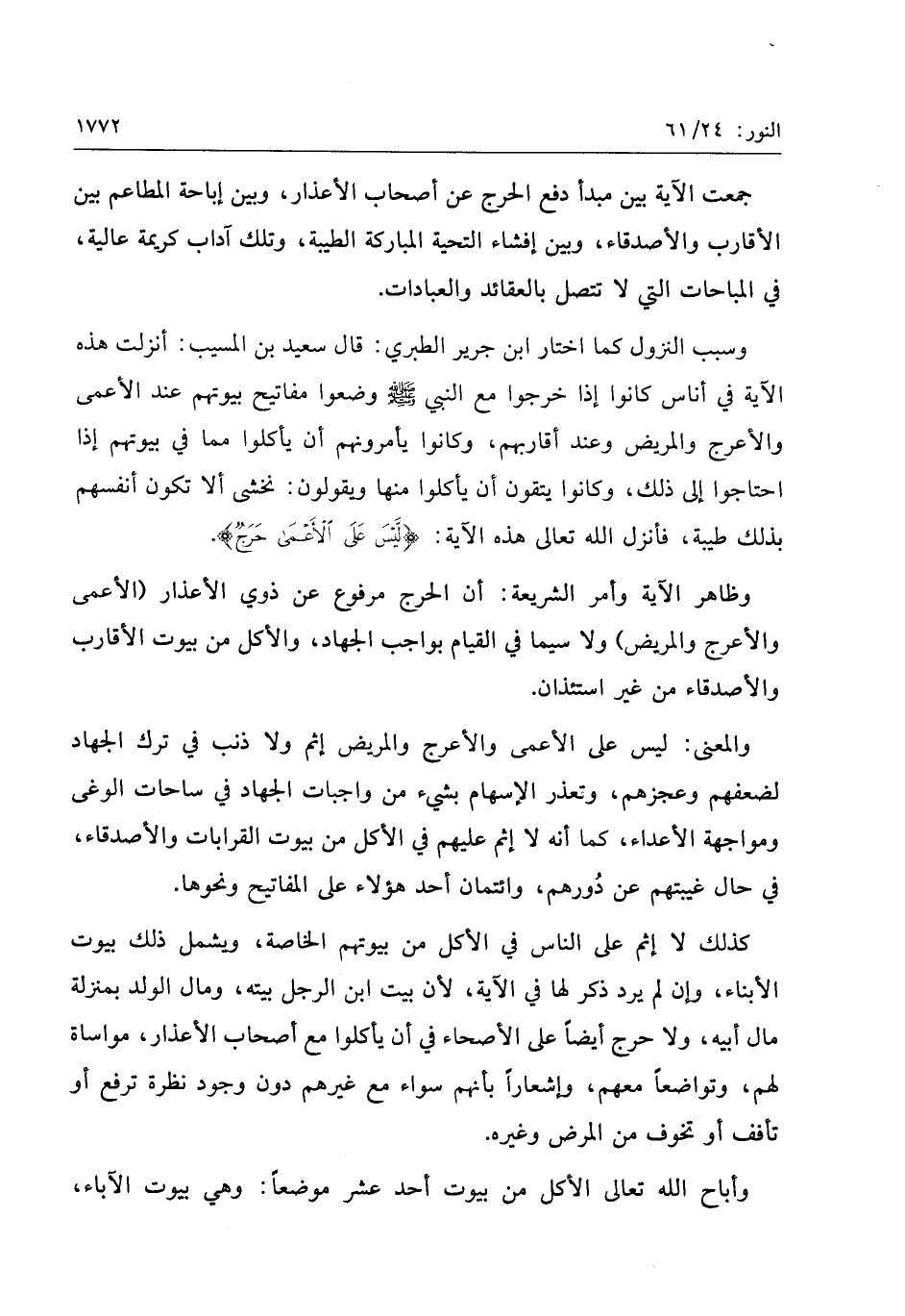 وسبب النزول كما اختار ابن جرير الطبري: قال سعيد بن المسيب: أنزلت هذه الآية في أناس كانوا إذا خرجوا مع النبي صلّى الله عليه وسلّم وضعوا مفاتيح بيوتهم عند الأعمى والأعرج والمريض وعند أقاربهم، وكانوا يأمرونهم أن يأكلوا مما في بيوتهم إذا احتاجوا إلى ذلك، وكانوا يتقون أن يأكلوا منها ويقولون: نخشى ألا تكون أنفسهم بذلك طيبة، فأنزل الله تعالى هذه الآية: لَيْسَ عَلَى الْأَعْمى حَرَجٌ.