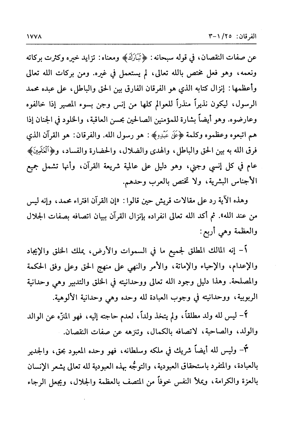 عن صفات النقصان، في قوله سبحانه: تَبارَكَ ومعناه: تزايد خيره وكثرت بركاته ونعمه، وهو فعل مختص بالله تعالى، لم يستعمل في غيره. ومن بركات الله تعالى وأعظمها: إنزال كتابه الذي هو الفرقان الفارق بين الحق والباطل، على عبده محمد الرسول، ليكون نذيرا منذرا للعوالم كلها من إنس وجن بسوء المصير إذا خالفوه وعارضوه. وهو أيضا بشارة للمؤمنين الصالحين بحسن العاقبة، والخلود في الجنان إذا هم اتبعوه وعظموه وكلمة عَلى عَبْدِهِ: هو رسول الله. والفرقان: هو القرآن الذي فرق الله به بين الحق والباطل، والهدى والضلال، والحضارة والفساد، ولِلْعالَمِينَ عام في كل إنسي وجني، وهو دليل على عالمية شريعة القرآن، وأنها تشمل جميع الأجناس البشرية، ولا تختص بالعرب وحدهم.