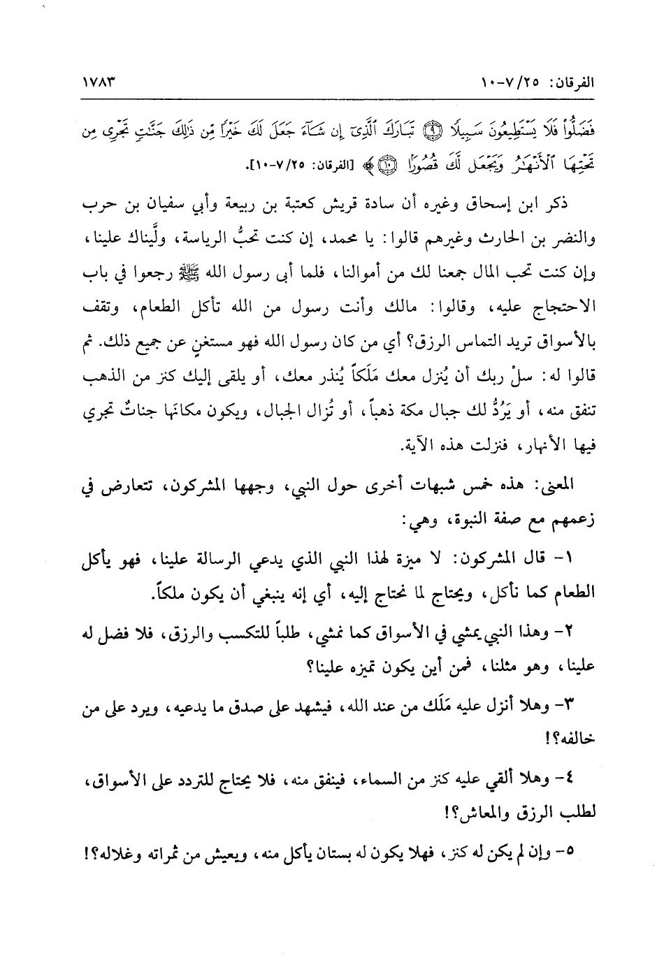 المعنى: هذه خمس شبهات أخرى حول النبي، وجهها المشركون، تتعارض في زعمهم مع صفة النبوة، وهي: