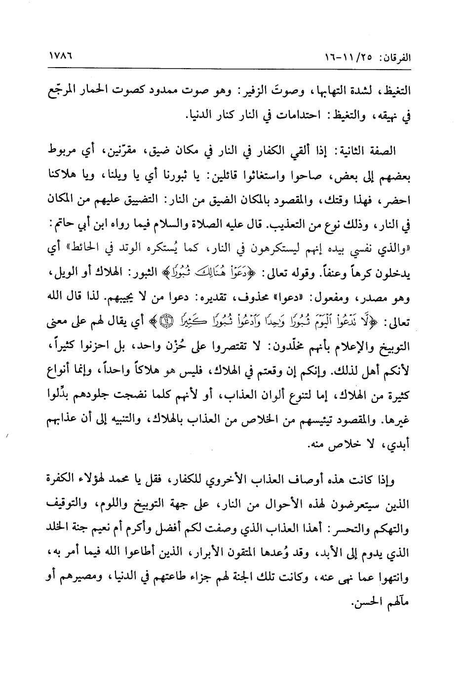 الصفة الثانية: إذا ألقي الكفار في النار في مكان ضيق، مقرّنين، أي مربوط بعضهم إلى بعض، صاحوا واستغاثوا قائلين: يا ثبورنا أي يا ويلنا، ويا هلاكنا احضر، فهذا وقتك، والمقصود بالمكان الضيق من النار: التضييق عليهم من المكان في النار، وذلك نوع من التعذيب.