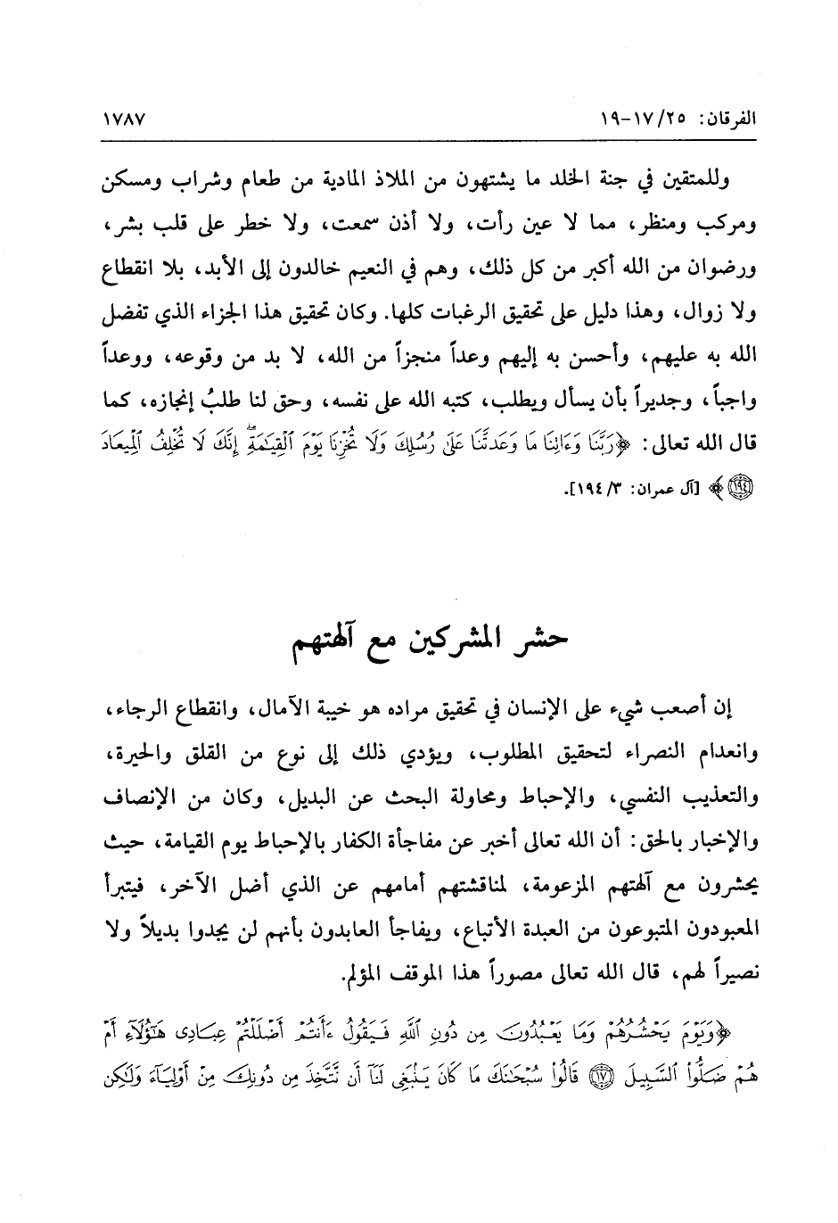 وَيَوْمَ يَحْشُرُهُمْ وَما يَعْبُدُونَ مِنْ دُونِ اللَّهِ فَيَقُولُ أَأَنْتُمْ أَضْلَلْتُمْ عِبادِي هؤُلاءِ أَمْ هُمْ ضَلُّوا السَّبِيلَ (17) قالُوا سُبْحانَكَ ما كانَ يَنْبَغِي لَنا أَنْ نَتَّخِذَ مِنْ دُونِكَ مِنْ أَوْلِياءَ وَلكِنْ مَتَّعْتَهُمْ وَآباءَهُمْ حَتَّى نَسُوا الذِّكْرَ وَكانُوا قَوْماً بُوراً (18) فَقَدْ كَذَّبُوكُمْ بِما تَقُولُونَ فَما تَسْتَطِيعُونَ صَرْفاً وَلا نَصْراً وَمَنْ يَظْلِمْ مِنْكُمْ نُذِقْهُ عَذاباً كَبِيراً (19)