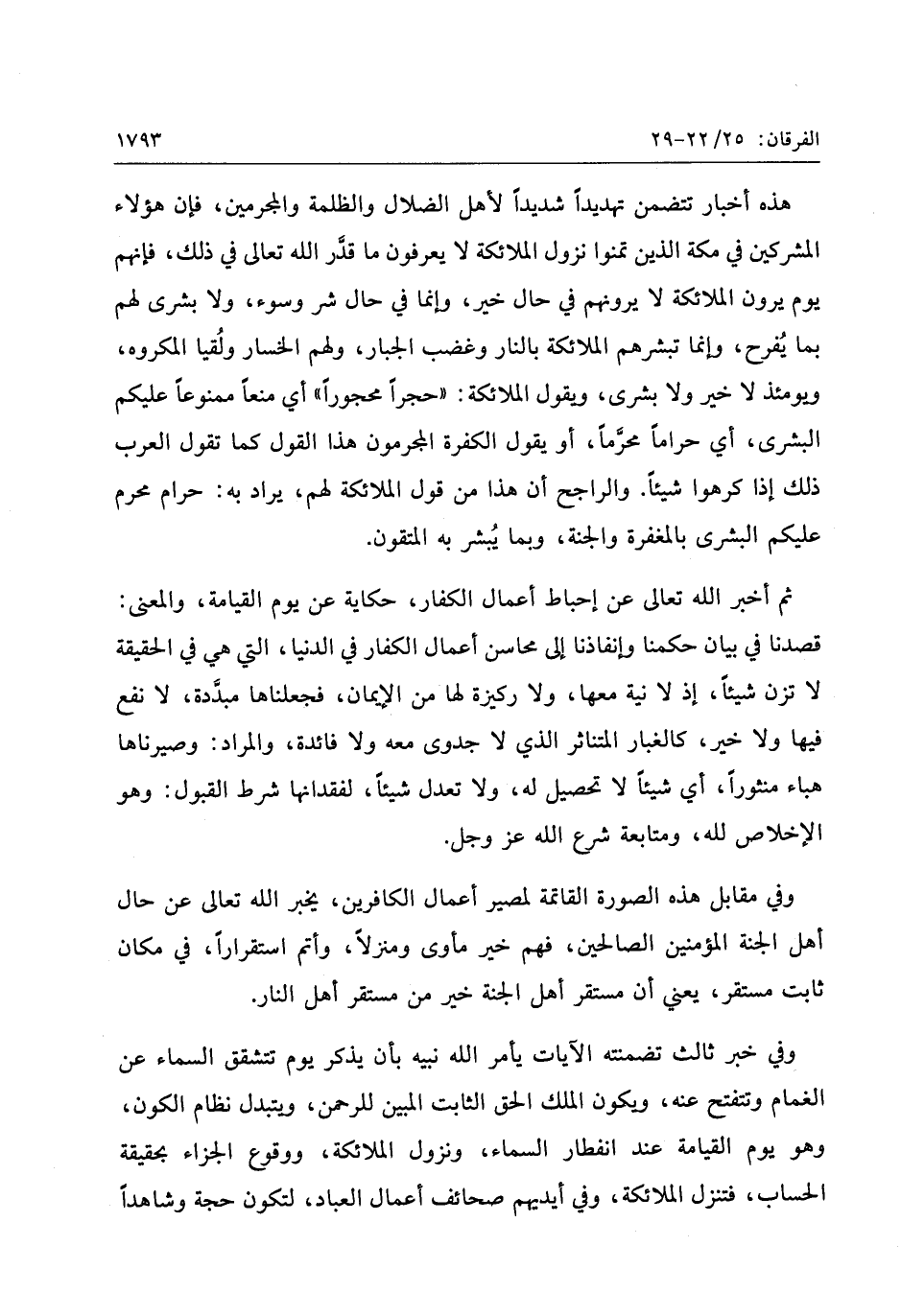 هذه أخبار تتضمن تهديدا شديدا لأهل الضلال والظلمة والمجرمين، فإن هؤلاء المشركين في مكة الذين تمنوا نزول الملائكة لا يعرفون ما قدّر الله تعالى في ذلك، فإنهم يوم يرون الملائكة لا يرونهم في حال خير، وإنما في حال شر وسوء، ولا بشرى لهم بما يفرح، وإنما تبشرهم الملائكة بالنار وغضب الجبار، ولهم الخسار ولقيا المكروه، ويومئذ لا خير ولا بشرى، ويقول الملائكة: «حجرا محجورا» أي منعا ممنوعا عليكم البشرى، أي حراما محرّما، أو يقول الكفرة المجرمون هذا القول كما تقول العرب ذلك إذا كرهوا شيئا. والراجح أن هذا من قول الملائكة لهم، يراد به: حرام محرم عليكم البشرى بالمغفرة والجنة، وبما يبشر به المتقون.