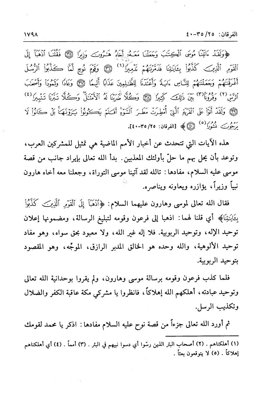 وَلَقَدْ آتَيْنا مُوسَى الْكِتابَ وَجَعَلْنا مَعَهُ أَخاهُ هارُونَ وَزِيراً (35) فَقُلْنَا اذْهَبا إِلَى الْقَوْمِ الَّذِينَ كَذَّبُوا بِآياتِنا فَدَمَّرْناهُمْ تَدْمِيراً (36) وَقَوْمَ نُوحٍ لَمَّا كَذَّبُوا الرُّسُلَ أَغْرَقْناهُمْ وَجَعَلْناهُمْ لِلنَّاسِ آيَةً وَأَعْتَدْنا لِلظَّالِمِينَ عَذاباً أَلِيماً (37) وَعاداً وَثَمُودَ وَأَصْحابَ الرَّسِّ وَقُرُوناً بَيْنَ ذلِكَ كَثِيراً (38) وَكُلاًّ ضَرَبْنا لَهُ الْأَمْثالَ وَكُلاًّ تَبَّرْنا تَتْبِيراً (39)