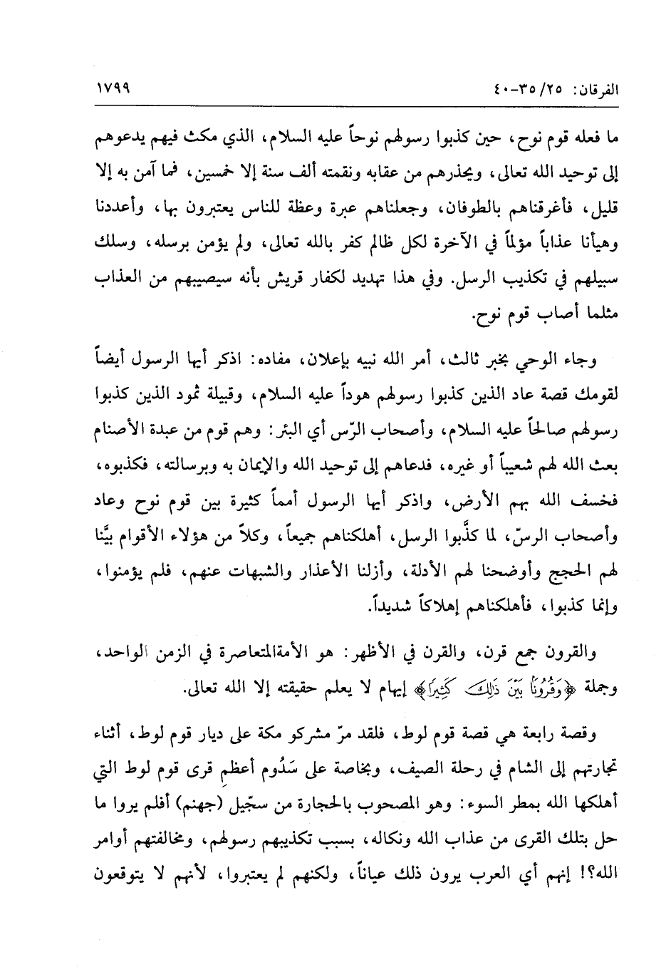 وجاء الوحي بخبر ثالث، أمر الله نبيه بإعلان، مفاده: اذكر أيها الرسول أيضا لقومك قصة عاد الذين كذبوا رسولهم هودا عليه السلام، وقبيلة ثمود الذين كذبوا رسولهم صالحا عليه السلام، وأصحاب الرّس أي البئر: وهم قوم من عبدة الأصنام بعث الله لهم شعيبا أو غيره، فدعاهم إلى توحيد الله والإيمان به وبرسالته، فكذبوه، فخسف الله بهم الأرض، واذكر أيها الرسول أمما كثيرة بين قوم نوح وعاد وأصحاب الرسّ، لما كذّبوا الرسل، أهلكناهم جميعا، وكلا من هؤلاء الأقوام بيّنا لهم الحجج وأوضحنا لهم الأدلة، وأزلنا الأعذار والشبهات عنهم، فلم يؤمنوا، وإنما كذبوا، فأهلكناهم إهلاكا شديدا.