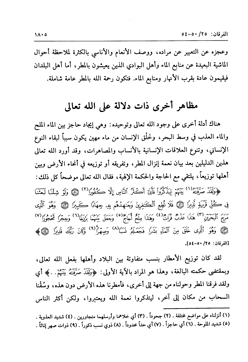 لقد كان توزيع الأمطار بنسب متفاوتة بين البلاد وأهلها بفعل الله تعالى، وبمقتضى حكمته البالغة، وهذا هو المراد بالآية الأولى: وَلَقَدْ صَرَّفْناهُ بَيْنَهُمْ.. أي ولقد فرقنا المطر وحولناه من جهة إلى أخرى، فأمطرنا هذه الأرض دون هذه، وسقنا السحاب من مكان إلى آخر، ليتذكروا نعمة الله ويعتبروا، ولكن أكثر الناس