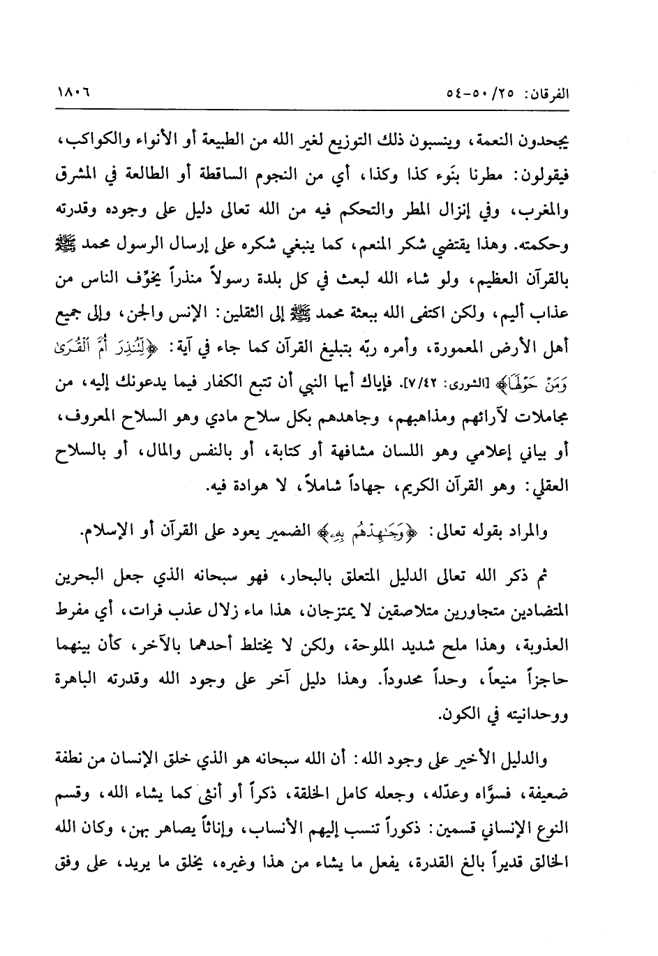 يجحدون النعمة، وينسبون ذلك التوزيع لغير الله من الطبيعة أو الأنواء والكواكب، فيقولون: مطرنا بنوء كذا وكذا، أي من النجوم الساقطة أو الطالعة في المشرق والمغرب، وفي إنزال المطر والتحكم فيه من الله تعالى دليل على وجوده وقدرته وحكمته. وهذا يقتضي شكر المنعم، كما ينبغي شكره على إرسال الرسول محمد صلّى الله عليه وسلّم بالقرآن العظيم، ولو شاء الله لبعث في كل بلدة رسولا منذرا يخوّف الناس من عذاب أليم، ولكن اكتفى الله ببعثة محمد صلّى الله عليه وسلّم إلى الثقلين: الإنس والجن، وإلى جميع أهل الأرض المعمورة، وأمره ربّه بتبليغ القرآن كما جاء في آية: لِتُنْذِرَ أُمَّ الْقُرى وَمَنْ حَوْلَها [الشورى: 42/ 7] . فإياك أيها النبي أن تتبع الكفار فيما يدعونك إليه، من مجاملات لآرائهم ومذاهبهم، وجاهدهم بكل سلاح مادي وهو السلاح المعروف، أو بياني إعلامي وهو اللسان مشافهة أو كتابة، أو بالنفس والمال، أو بالسلاح العقلي: وهو القرآن الكريم، جهادا شاملا، لا هوادة فيه.