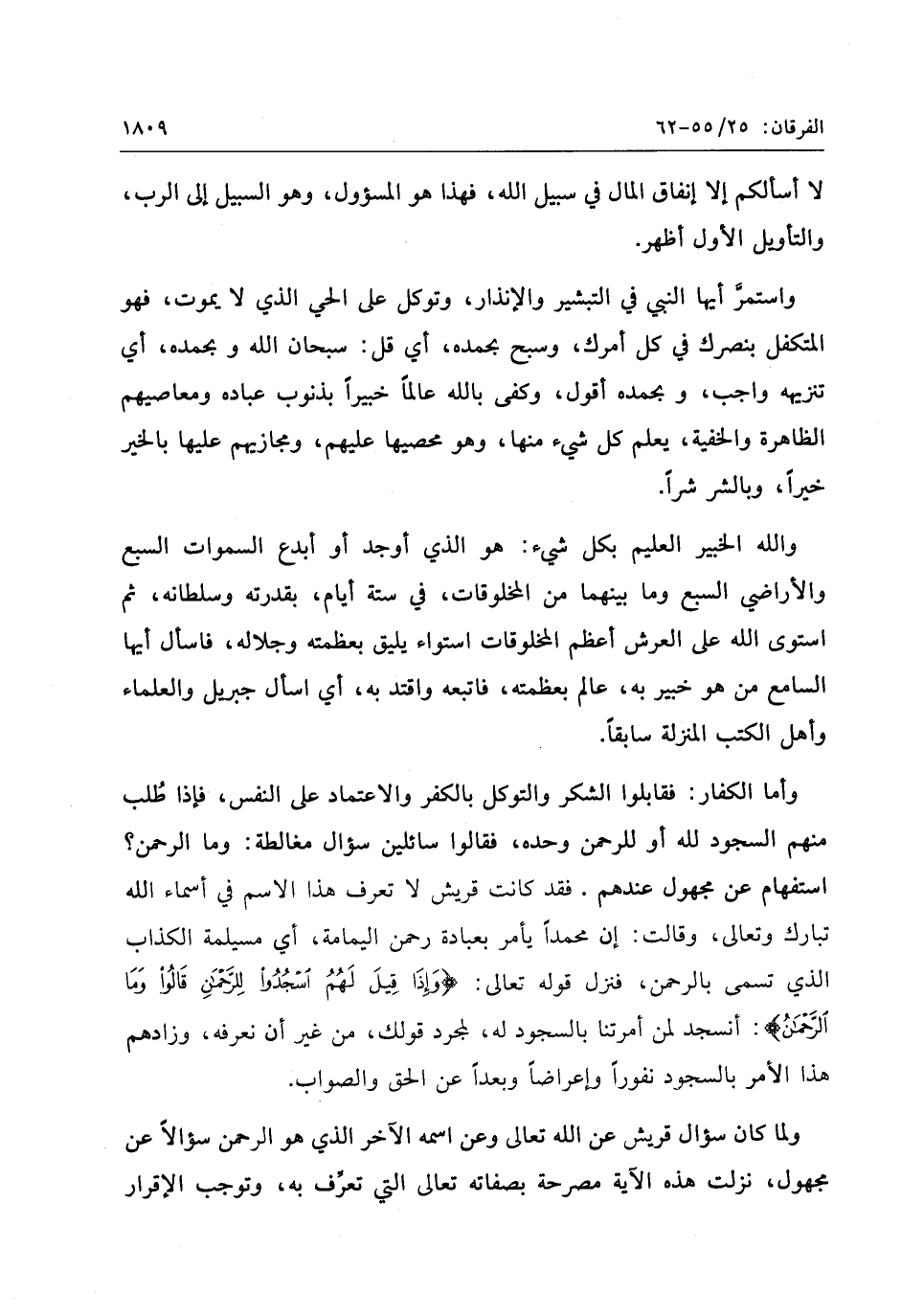 والله الخبير العليم بكل شيء: هو الذي أوجد أو أبدع السموات السبع والأراضي السبع وما بينهما من المخلوقات، في ستة أيام، بقدرته وسلطانه، ثم استوى الله على العرش أعظم المخلوقات استواء يليق بعظمته وجلاله، فاسأل أيها السامع من هو خبير به، عالم بعظمته، فاتبعه واقتد به، أي اسأل جبريل والعلماء وأهل الكتب المنزلة سابقا.