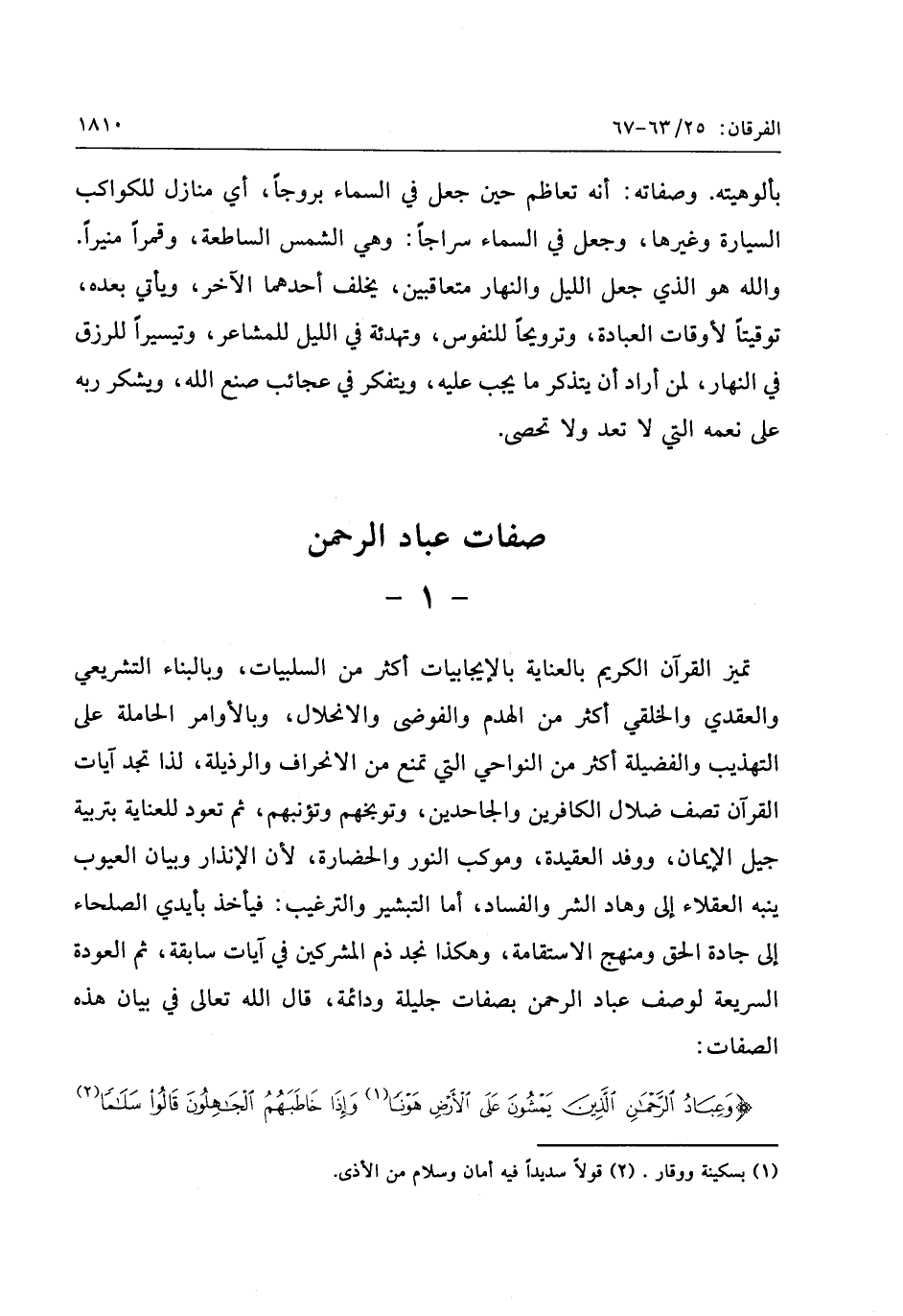 وَعِبادُ الرَّحْمنِ الَّذِينَ يَمْشُونَ عَلَى الْأَرْضِ هَوْناً وَإِذا خاطَبَهُمُ الْجاهِلُونَ قالُوا سَلاماً (63) وَالَّذِينَ يَبِيتُونَ لِرَبِّهِمْ سُجَّداً وَقِياماً (64) وَالَّذِينَ يَقُولُونَ رَبَّنَا اصْرِفْ عَنَّا عَذابَ جَهَنَّمَ إِنَّ عَذابَها كانَ غَراماً (65) إِنَّها ساءَتْ مُسْتَقَرًّا وَمُقاماً (66) وَالَّذِينَ إِذا أَنْفَقُوا لَمْ يُسْرِفُوا وَلَمْ يَقْتُرُوا وَكانَ بَيْنَ ذلِكَ قَواماً (67)