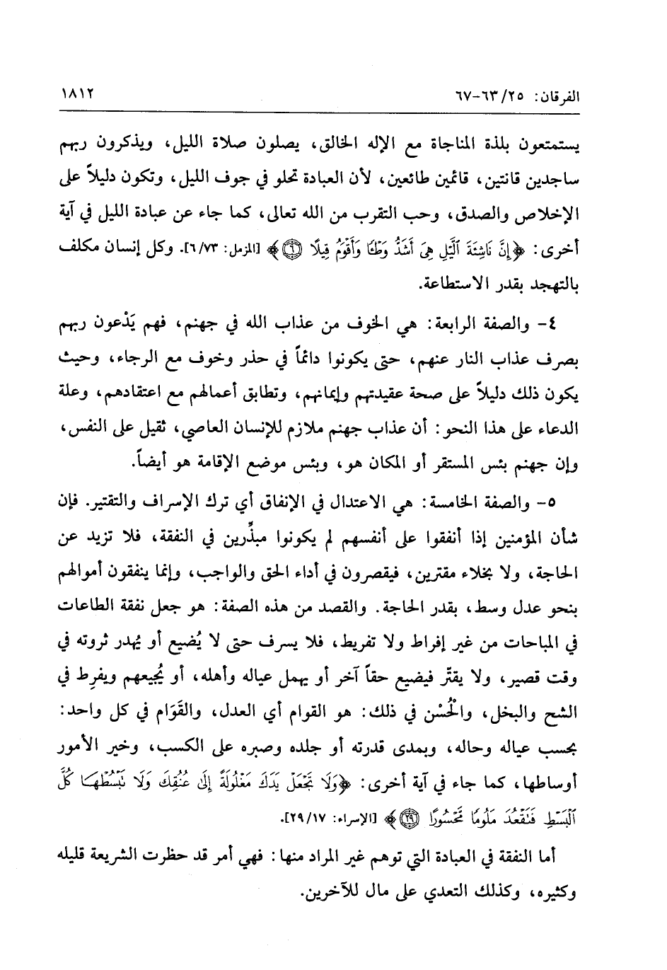 5- والصفة الخامسة: هي الاعتدال في الإنفاق أي ترك الإسراف والتقتير. فإن شأن المؤمنين إذا أنفقوا على أنفسهم لم يكونوا مبذّرين في النفقة، فلا تزيد عن الحاجة، ولا بخلاء مقترين، فيقصرون في أداء الحق والواجب، وإنما ينفقون أموالهم بنحو عدل وسط، بقدر الحاجة. والقصد من هذه الصفة: هو جعل نفقة الطاعات في المباحات من غير إفراط ولا تفريط، فلا يسرف حتى لا يضيع أو يهدر ثروته في وقت قصير، ولا يقتّر فيضيع حقا آخر أو يهمل عياله وأهله، أو يجيعهم ويفرط في الشح والبخل، والحسن في ذلك: هو القوام أي العدل، والقوام في كل واحد:
