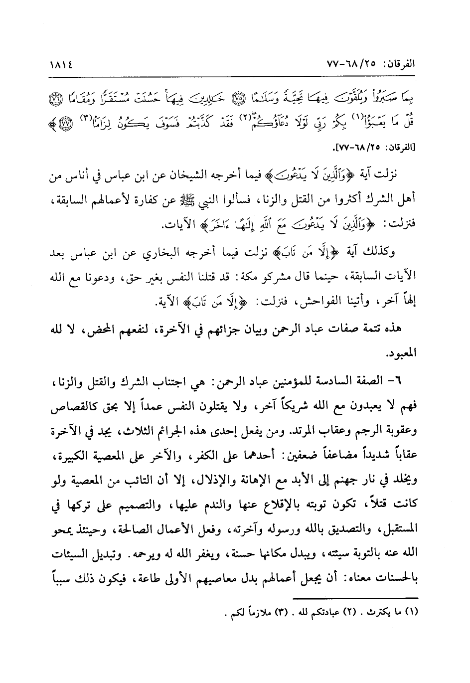 6- الصفة السادسة للمؤمنين عباد الرحمن: هي اجتناب الشرك والقتل والزنا، فهم لا يعبدون مع الله شريكا آخر، ولا يقتلون النفس عمدا إلا بحق كالقصاص وعقوبة الرجم وعقاب المرتد. ومن يفعل إحدى هذه الجرائم الثلاث، يجد في الآخرة عقابا شديدا مضاعفا ضعفين: أحدهما على الكفر، والآخر على المعصية الكبيرة، ويخلد في نار جهنم إلى الأبد مع الإهانة والإذلال، إلا أن التائب من المعصية ولو كانت قتلا، تكون توبته بالإقلاع عنها والندم عليها، والتصميم على تركها في المستقبل، والتصديق بالله ورسوله وآخرته، وفعل الأعمال الصالحة، وحينئذ يمحو الله عنه بالتوبة سيئته، ويبدل مكانها حسنة، ويغفر الله له ويرحمه. وتبديل السيئات بالحسنات معناه: أن يجعل أعمالهم بدل معاصيهم الأولى طاعة، فيكون ذلك سببا