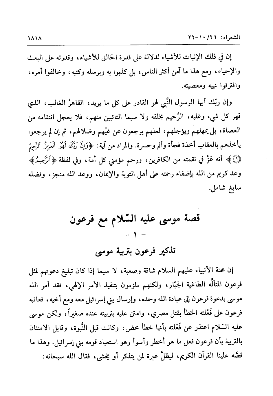 إن محنة الأنبياء عليهم السلام شاقة وصعبة، لا سيما إذا كان تبليغ دعوتهم لمثل فرعون المتألّه الطاغية الجبّار، ولكنهم ملزمون بتنفيذ الأمر الإلهي، فقد أمر الله موسى بدعوة فرعون إلى عبادة الله وحده، وإرسال بني إسرائيل معه ومع أخيه، فعاتبه فرعون على فعلته الخطأ بقتل مصري، وامتن عليه بتربيته عنده صغيرا، ولكن موسى عليه السّلام اعتذر عن فعلته بأنها خطأ محض، وكانت قبل النّبوة، وقابل الامتنان بالتربية بأن فرعون فعل ما هو أخطر وأسوأ وهو استعباد قومه بني إسرائيل. وهذا ما قصّه علينا القرآن الكريم، ليظلّ عبرة لمن يتذكر أو يخشى، فقال الله سبحانه: