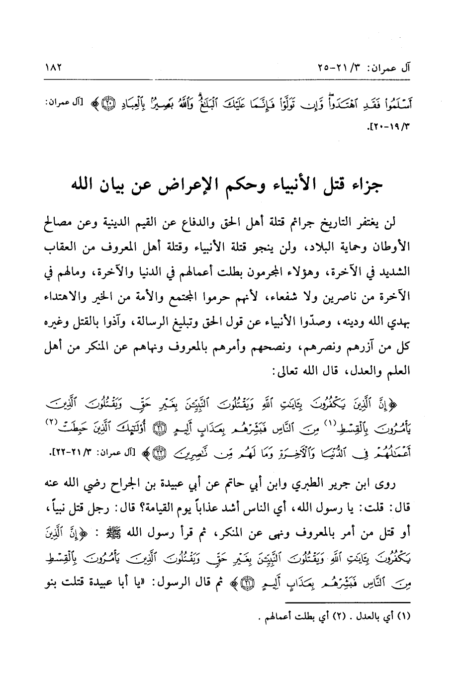 جزاء قتل الأنبياء وحكم الإعراض عن بيان الله