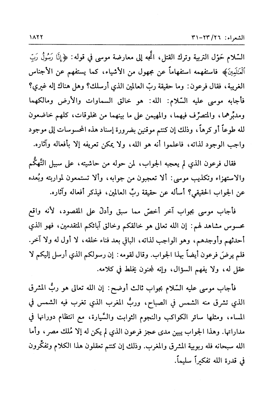 فأجابه موسى عليه السّلام: الله: هو خالق السماوات والأرض ومالكهما ومدبّرهما، والمتصرّف فيهما، والمهيمن على ما بينهما من مخلوقات، كلهم خاضعون لله طوعا أو كرها، وذلك إن كنتم موقنين بضرورة إسناد هذه المحسوسات إلى موجود واجب الوجود لذاته، فاعلموا أنه هو الله، ولا يمكن تعريفه إلا بأفعاله وآثاره.