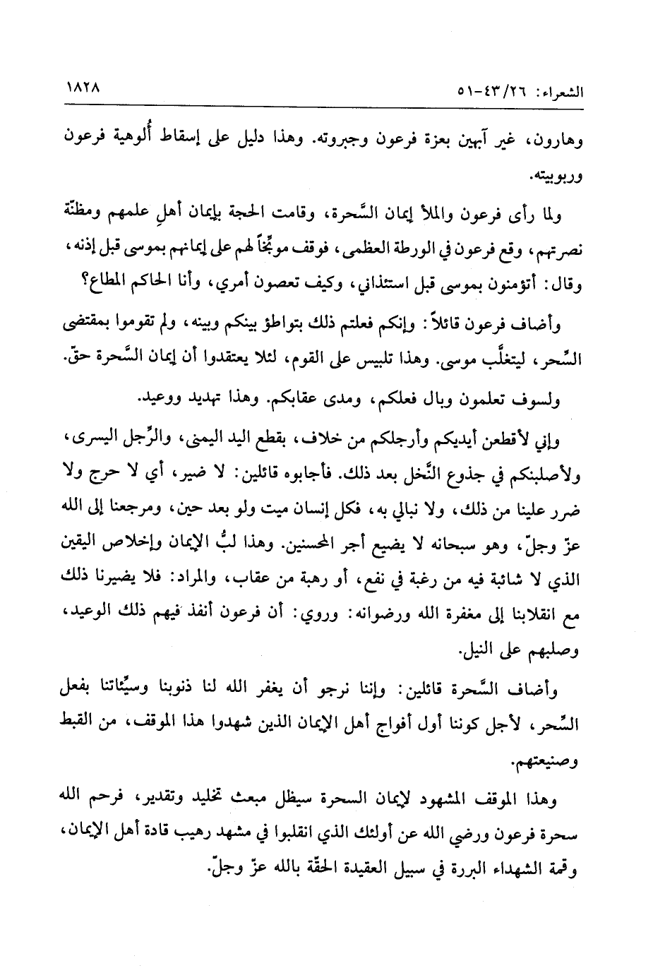 وإني لأقطعن أيديكم وأرجلكم من خلاف، بقطع اليد اليمنى، والرّجل اليسرى، ولأصلبنكم في جذوع النّخل بعد ذلك. فأجابوه قائلين: لا ضير، أي لا حرج ولا ضرر علينا من ذلك، ولا نبالي به، فكل إنسان ميت ولو بعد حين، ومرجعنا إلى الله عزّ وجلّ، وهو سبحانه لا يضيع أجر المحسنين. وهذا لبّ الإيمان وإخلاص اليقين الذي لا شائبة فيه من رغبة في نفع، أو رهبة من عقاب، والمراد: فلا يضيرنا ذلك مع انقلابنا إلى مغفرة الله ورضوانه: وروي: أن فرعون أنفذ فيهم ذلك الوعيد، وصلبهم على النيل.