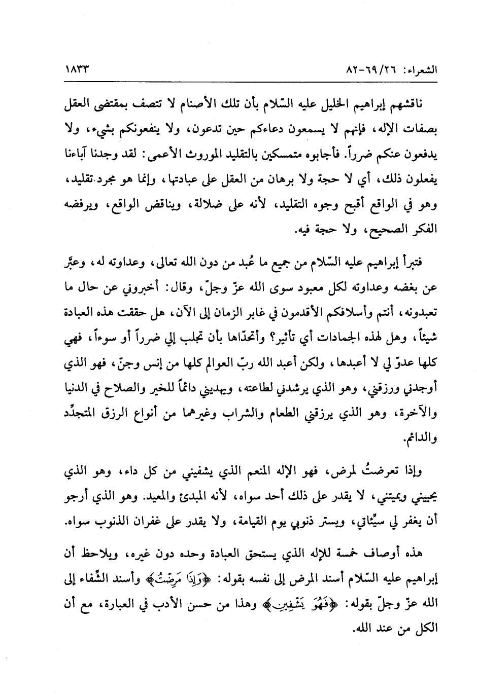 هذه أوصاف خمسة للإله الذي يستحق العبادة وحده دون غيره، ويلاحظ أن إبراهيم عليه السّلام أسند المرض إلى نفسه بقوله: وَإِذا مَرِضْتُ وأسند الشّفاء إلى الله عزّ وجلّ بقوله: فَهُوَ يَشْفِينِ وهذا من حسن الأدب في العبارة، مع أن الكل من عند الله.
