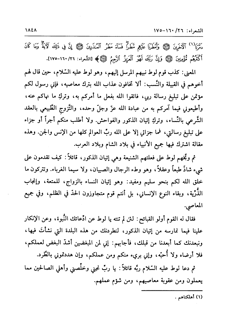 المعنى: كذب قوم لوط نبيهم المرسل إليهم، وهو لوط عليه السّلام، حين قال لهم أخوهم في القبيلة والنّسب: ألا تخافون عذاب الله بترك معاصيه، فإني رسول لكم مؤتمن على تبليغ رسالة ربي، فاتقوا الله بفعل ما أمركم به، وترك ما نهاكم عنه، وأطيعوني فيما آمركم به من عبادة الله عزّ وجلّ وحده، والتّزوج الطّبيعي بالعقد الشّرعي بالنّساء، وترك إتيان الذكور والفواحش. ولا أطلب منكم أجرا أو جزاء على تبليغ رسالتي، فما جزائي إلا على الله ربّ العوالم كلها من الإنس والجن. وهذه مقالة اشترك فيها جميع الأنبياء في بلاد الشام وبلاد العرب.