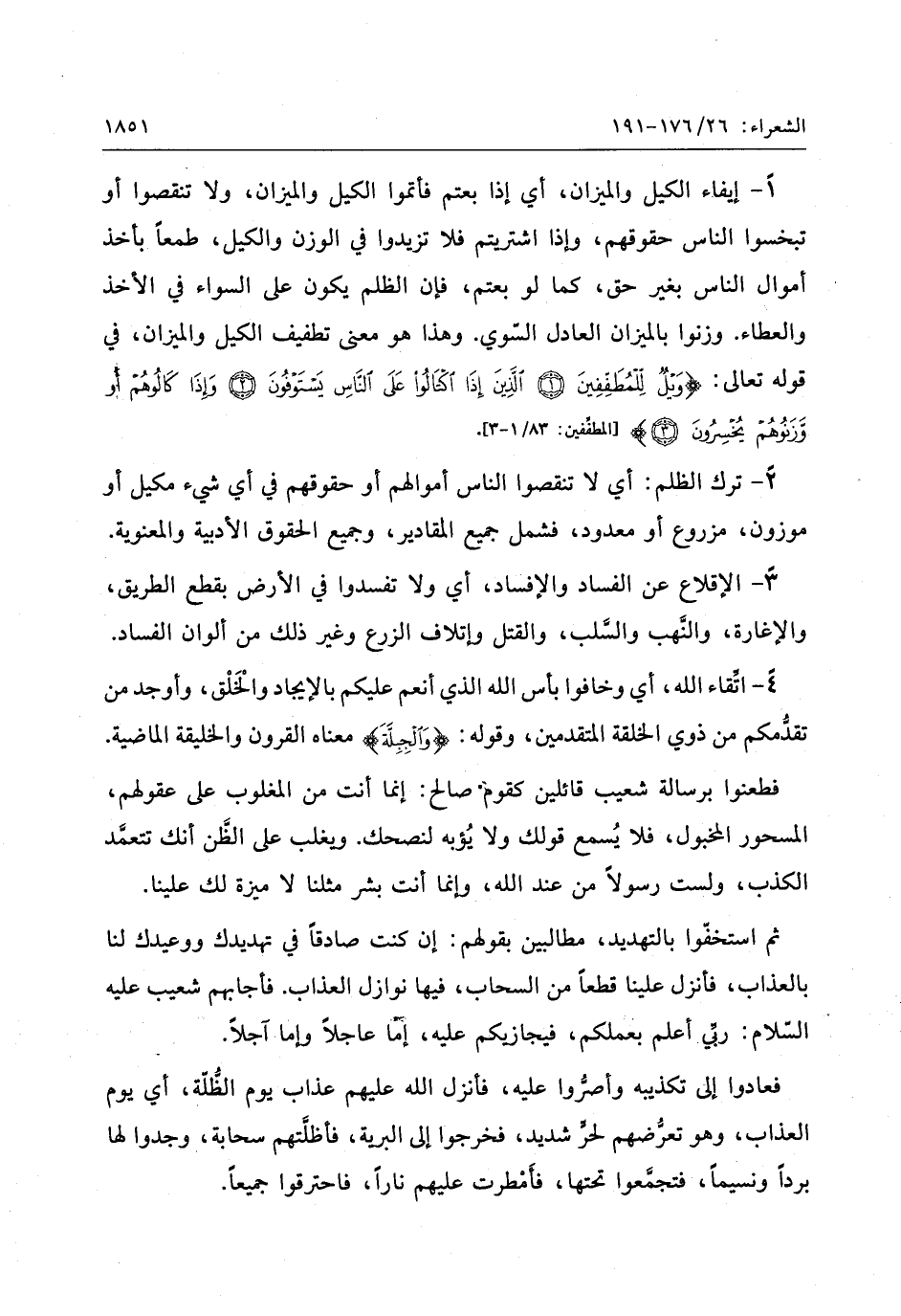1- إيفاء الكيل والميزان، أي إذا بعتم فأتموا الكيل والميزان، ولا تنقصوا أو تبخسوا الناس حقوقهم، وإذا اشتريتم فلا تزيدوا في الوزن والكيل، طمعا بأخذ أموال الناس بغير حق، كما لو بعتم، فإن الظلم يكون على السواء في الأخذ والعطاء. وزنوا بالميزان العادل السّوي. وهذا هو معنى تطفيف الكيل والميزان، في قوله تعالى: وَيْلٌ لِلْمُطَفِّفِينَ (1) الَّذِينَ إِذَا اكْتالُوا عَلَى النَّاسِ يَسْتَوْفُونَ (2) وَإِذا كالُوهُمْ أَوْ وَزَنُوهُمْ يُخْسِرُونَ (3) [المطفّفين: 83/ 1- 3] .