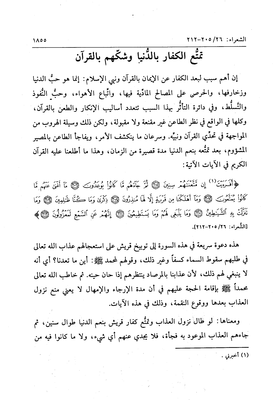أَفَرَأَيْتَ إِنْ مَتَّعْناهُمْ سِنِينَ (205) ثُمَّ جاءَهُمْ ما كانُوا يُوعَدُونَ (206) ما أَغْنى عَنْهُمْ ما كانُوا يُمَتَّعُونَ (207) وَما أَهْلَكْنا مِنْ قَرْيَةٍ إِلاَّ لَها مُنْذِرُونَ (208) ذِكْرى وَما كُنَّا ظالِمِينَ (209)