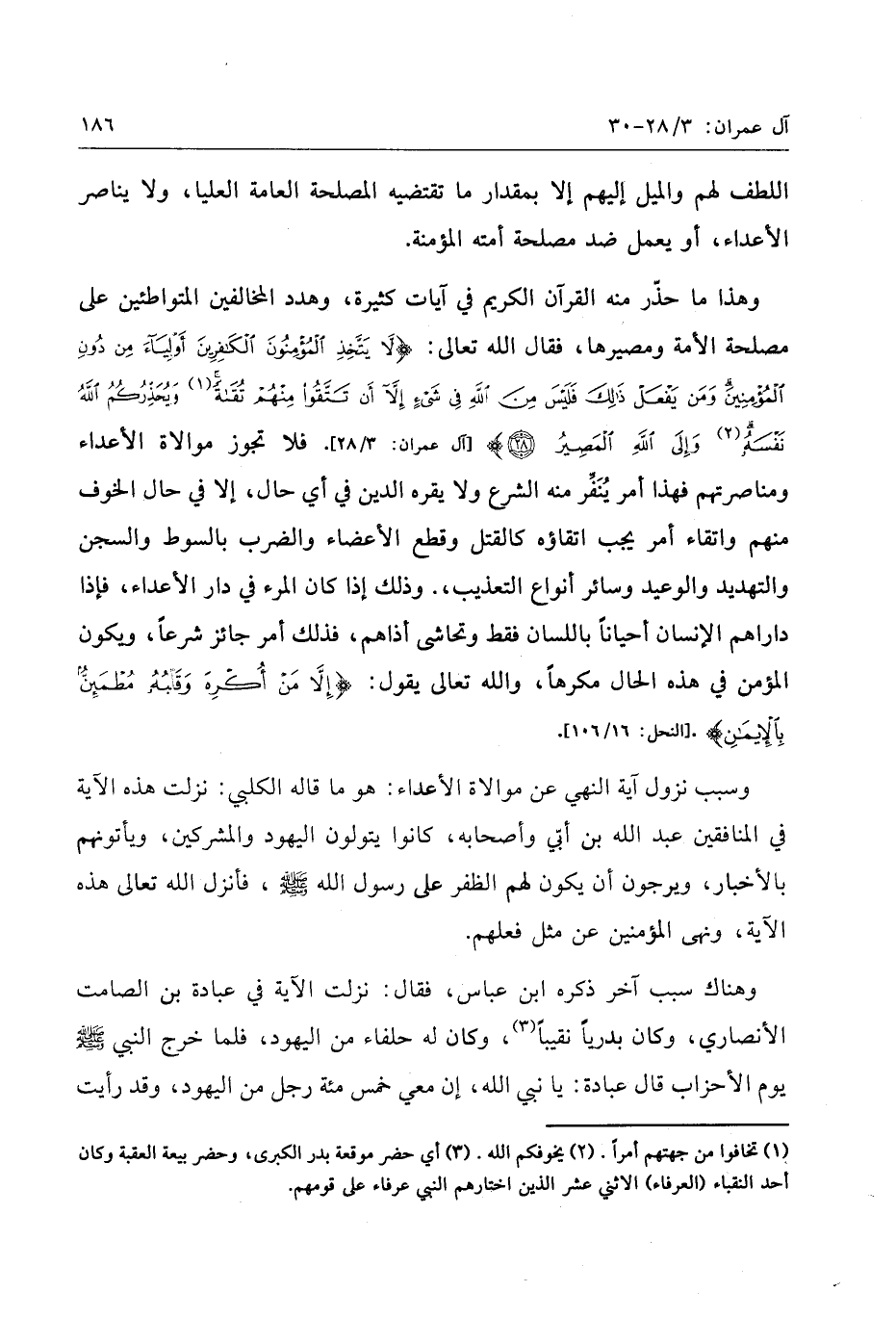 «1» «2» [آل عمران: 3/ 28] . فلا تجوز موالاة الأعداء ومناصرتهم فهذا أمر ينفّر منه الشرع ولا يقره الدين في أي حال، إلا في حال الخوف منهم واتقاء أمر يجب اتقاؤه كالقتل وقطع الأعضاء والضرب بالسوط والسجن والتهديد والوعيد وسائر أنواع التعذيب،. وذلك إذا كان المرء في دار الأعداء، فإذا داراهم الإنسان أحيانا باللسان فقط وتحاشى أذاهم، فذلك أمر جائز شرعا، ويكون المؤمن في هذه الحال مكرها، والله تعالى يقول: إِلَّا مَنْ أُكْرِهَ وَقَلْبُهُ مُطْمَئِنٌّ بِالْإِيمانِ. [النحل: 16/ 106] .