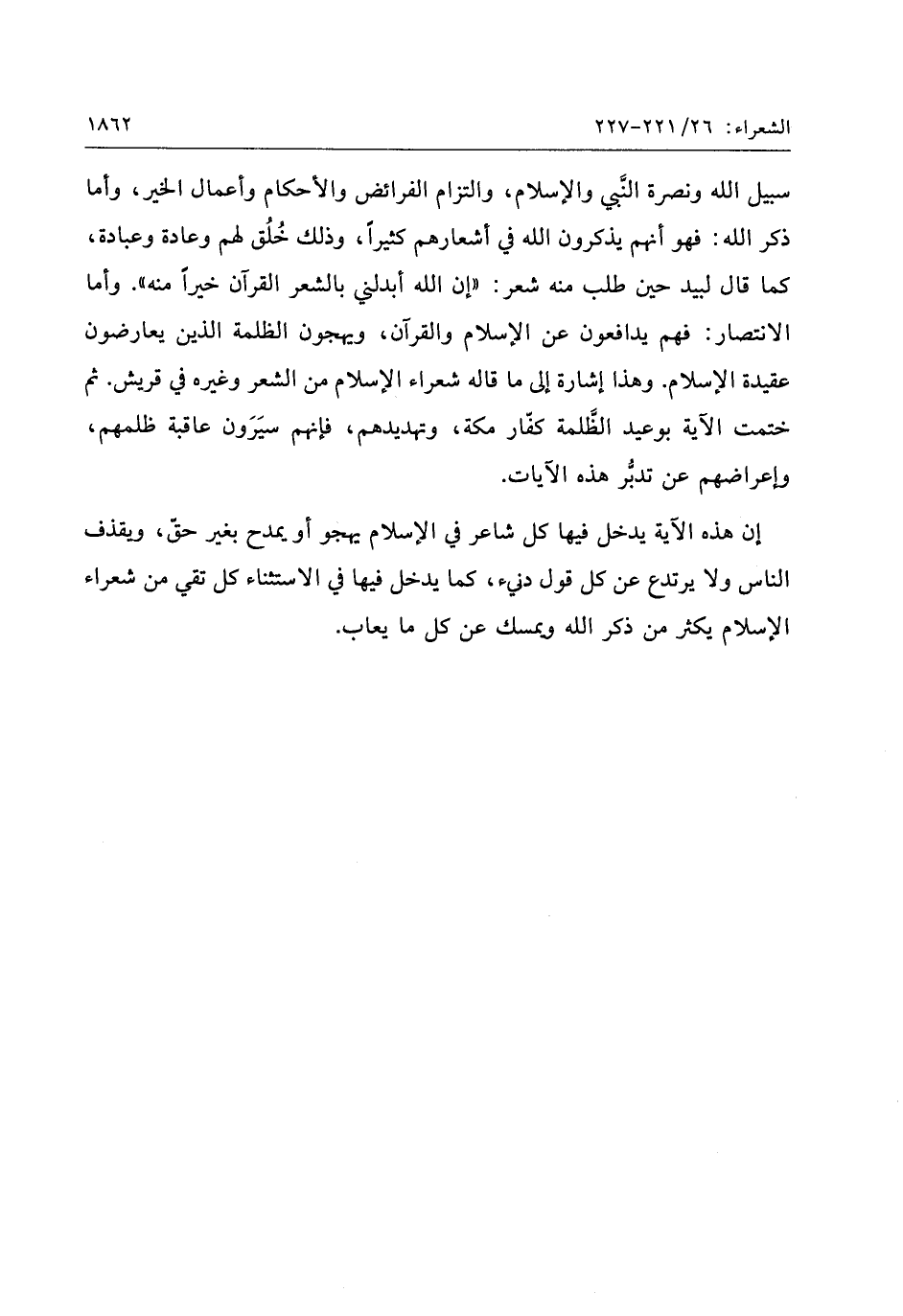 سبيل الله ونصرة النّبي والإسلام، والتزام الفرائض والأحكام وأعمال الخير، وأما ذكر الله: فهو أنهم يذكرون الله في أشعارهم كثيرا، وذلك خلق لهم وعادة وعبادة، كما قال لبيد حين طلب منه شعر: «إن الله أبدلني بالشعر القرآن خيرا منه» . وأما الانتصار: فهم يدافعون عن الإسلام والقرآن، ويهجون الظلمة الذين يعارضون عقيدة الإسلام. وهذا إشارة إلى ما قاله شعراء الإسلام من الشعر وغيره في قريش. ثم ختمت الآية بوعيد الظّلمة كفّار مكة، وتهديدهم، فإنهم سيرون عاقبة ظلمهم، وإعراضهم عن تدبّر هذه الآيات.