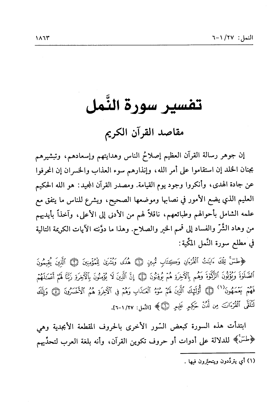 إن جوهر رسالة القرآن العظيم إصلاح الناس وهدايتهم وإسعادهم، وتبشيرهم بجنان الخلد إن استقاموا على أمر الله، وإنذارهم سوء العذاب، والخسران إن انحرفوا عن جادة الهدى، وأنكروا وجود يوم القيامة. ومصدر القرآن المجيد: هو الله الحكيم العليم الذي يضع الأمور في نصابها وموضعها الصحيح، ويشرع للناس ما يتفق مع علمه الشامل بأحوالهم وطبائعهم، ناقلا لهم من الأدنى إلى الأعلى، وآخذا بأيديهم من وهاد الشّرّ والفساد إلى قمم الخير والصلاح. وهذا ما دوّنته الآيات الكريمة التالية في مطلع سورة النّمل المكّية: