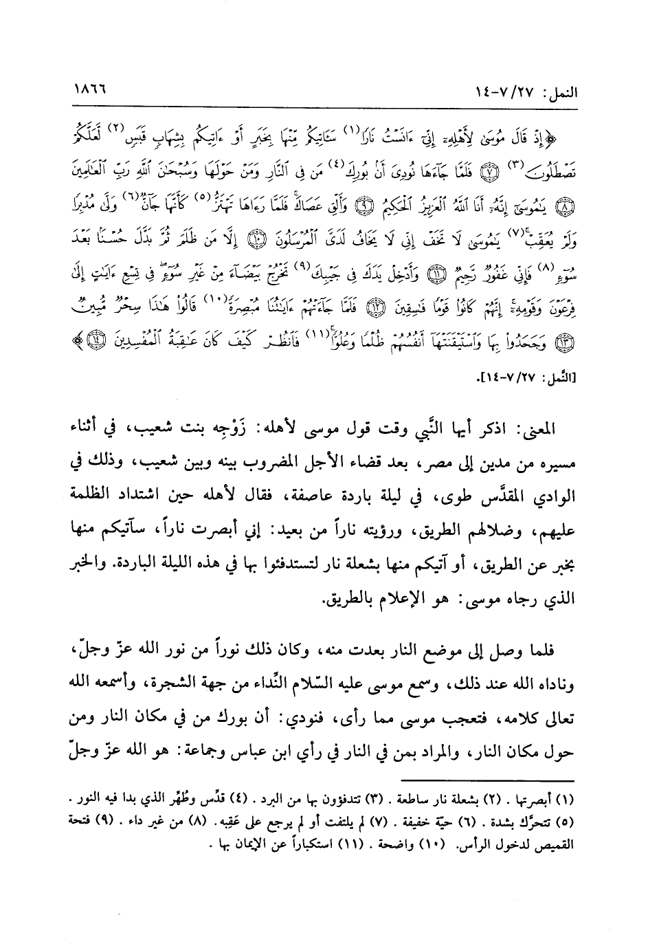إِذْ قالَ مُوسى لِأَهْلِهِ إِنِّي آنَسْتُ ناراً سَآتِيكُمْ مِنْها بِخَبَرٍ أَوْ آتِيكُمْ بِشِهابٍ قَبَسٍ لَعَلَّكُمْ تَصْطَلُونَ (7) فَلَمَّا جاءَها نُودِيَ أَنْ بُورِكَ مَنْ فِي النَّارِ وَمَنْ حَوْلَها وَسُبْحانَ اللَّهِ رَبِّ الْعالَمِينَ (8) يا مُوسى إِنَّهُ أَنَا اللَّهُ الْعَزِيزُ الْحَكِيمُ (9) وَأَلْقِ عَصاكَ فَلَمَّا رَآها تَهْتَزُّ كَأَنَّها جَانٌّ وَلَّى مُدْبِراً وَلَمْ يُعَقِّبْ يا مُوسى لا تَخَفْ إِنِّي لا يَخافُ لَدَيَّ الْمُرْسَلُونَ (10) إِلاَّ مَنْ ظَلَمَ ثُمَّ بَدَّلَ حُسْناً بَعْدَ سُوءٍ فَإِنِّي غَفُورٌ رَحِيمٌ (11)