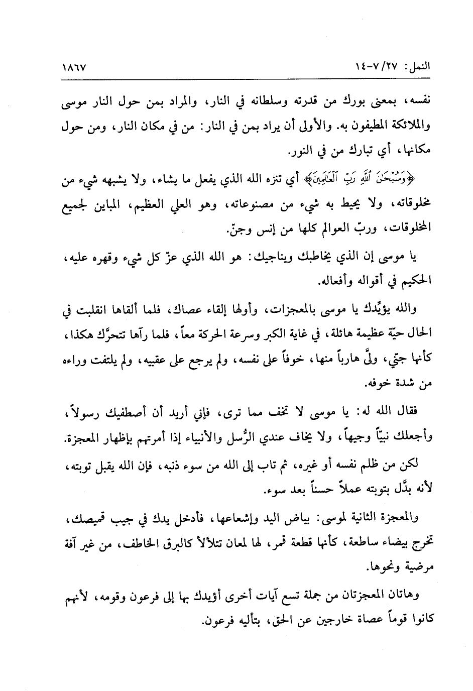 نفسه، بمعنى بورك من قدرته وسلطانه في النار، والمراد بمن حول النار موسى والملائكة المطيفون به. والأولى أن يراد بمن في النار: من في مكان النار، ومن حول مكانها، أي تبارك من في النور.
