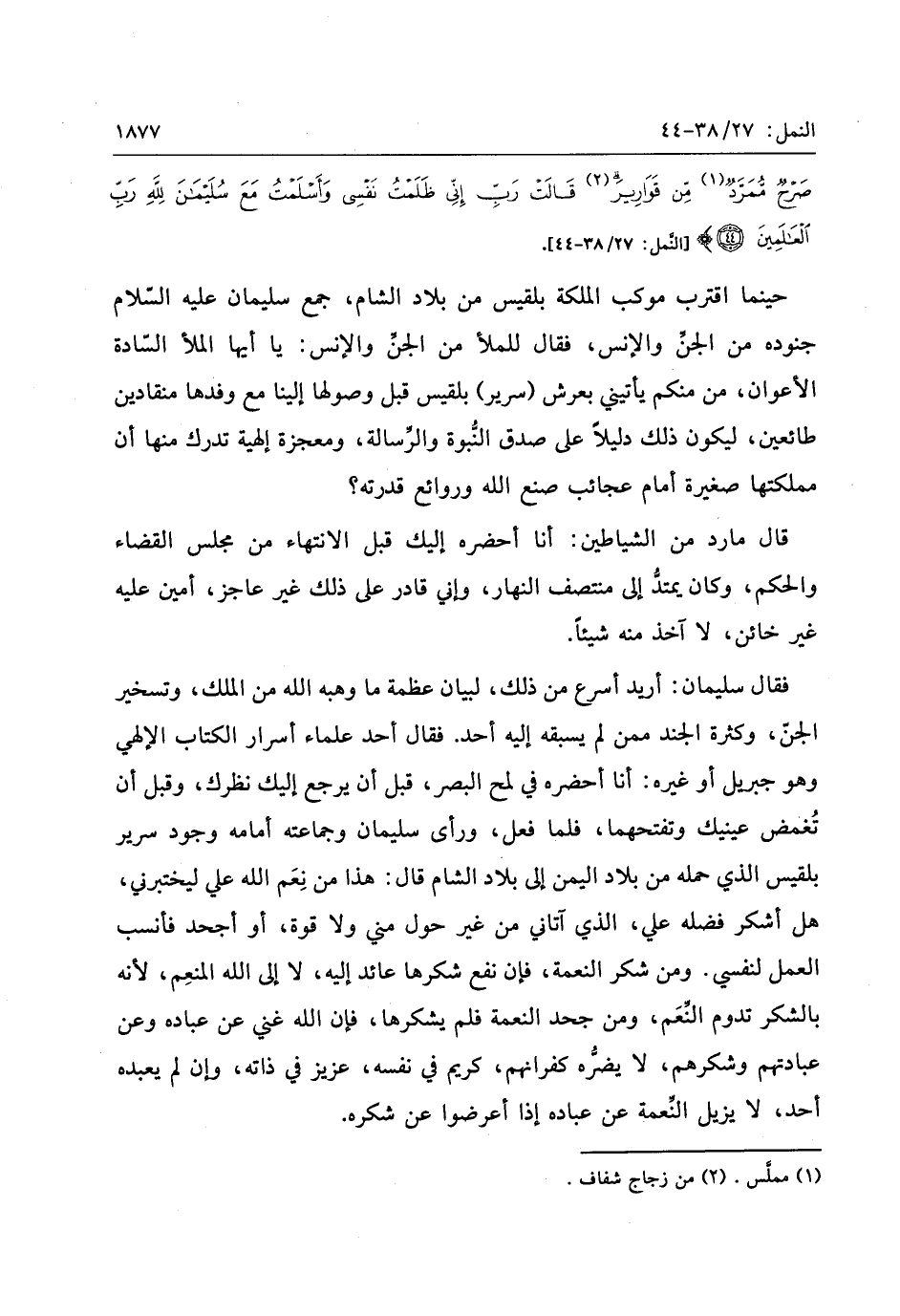 فقال سليمان: أريد أسرع من ذلك، لبيان عظمة ما وهبه الله من الملك، وتسخير الجنّ، وكثرة الجند ممن لم يسبقه إليه أحد. فقال أحد علماء أسرار الكتاب الإلهي وهو جبريل أو غيره: أنا أحضره في لمح البصر، قبل أن يرجع إليك نظرك، وقبل أن تغمض عينيك وتفتحهما، فلما فعل، ورأى سليمان وجماعته أمامه وجود سرير بلقيس الذي حمله من بلاد اليمن إلى بلاد الشام قال: هذا من نعم الله علي ليختبرني، هل أشكر فضله علي، الذي آتاني من غير حول مني ولا قوة، أو أجحد فأنسب العمل لنفسي. ومن شكر النعمة، فإن نفع شكرها عائد إليه، لا إلى الله المنعم، لأنه بالشكر تدوم النّعم، ومن جحد النعمة فلم يشكرها، فإن الله غني عن عباده وعن عبادتهم وشكرهم، لا يضرّه كفرانهم، كريم في نفسه، عزيز في ذاته، وإن لم يعبده أحد، لا يزيل النّعمة عن عباده إذا أعرضوا عن شكره.