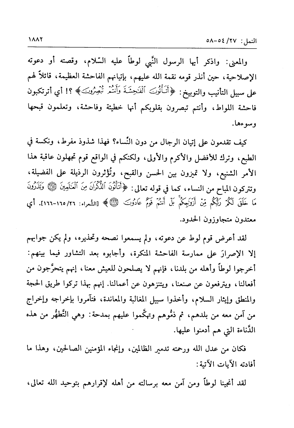 كيف تقدمون على إتيان الرجال من دون النّساء؟ فهذا شذوذ مفرط، ونكسة في الطبع، وترك للأفضل والأكرم والأولى، ولكنكم في الواقع قوم تجهلون عاقبة هذا الأمر الشنيع، ولا تميزون بين الحسن والقبح، وتؤثرون الرذيلة على الفضيلة، وتتركون المباح من النساء، كما في قوله تعالى: أَتَأْتُونَ الذُّكْرانَ مِنَ الْعالَمِينَ (165) وَتَذَرُونَ ما خَلَقَ لَكُمْ رَبُّكُمْ مِنْ أَزْواجِكُمْ بَلْ أَنْتُمْ قَوْمٌ عادُونَ (166) [الشّعراء: 26/ 165- 166] . أي معتدون متجاوزون الحدود.