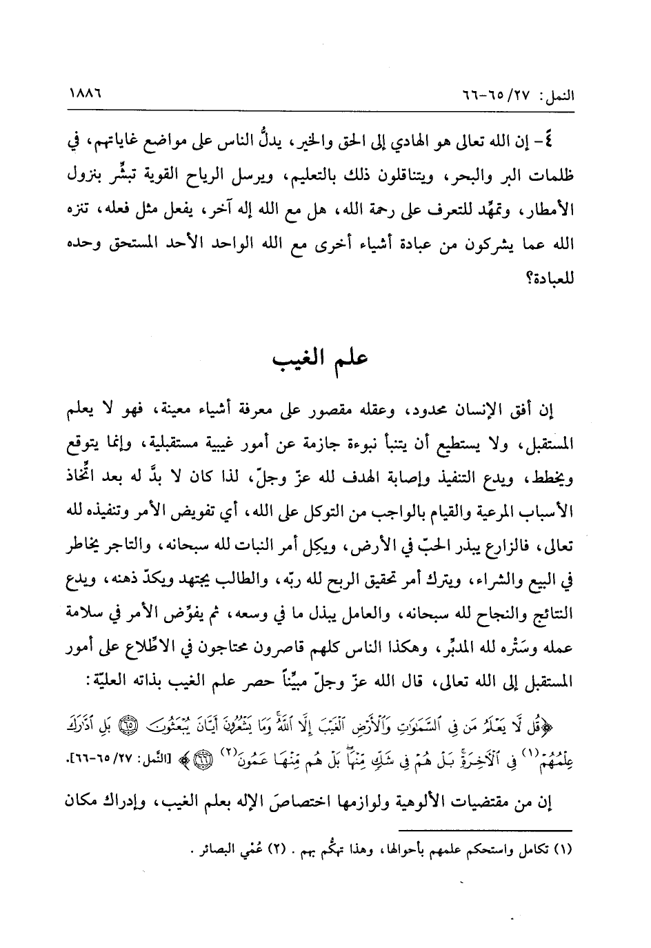 4- إن الله تعالى هو الهادي إلى الحق والخير، يدلّ الناس على مواضع غاياتهم، في ظلمات البر والبحر، ويتناقلون ذلك بالتعليم، ويرسل الرياح القوية تبشّر بنزول الأمطار، وتمهّد للتعرف على رحمة الله، هل مع الله إله آخر، يفعل مثل فعله، تنزه الله عما يشركون من عبادة أشياء أخرى مع الله الواحد الأحد المستحق وحده للعبادة؟