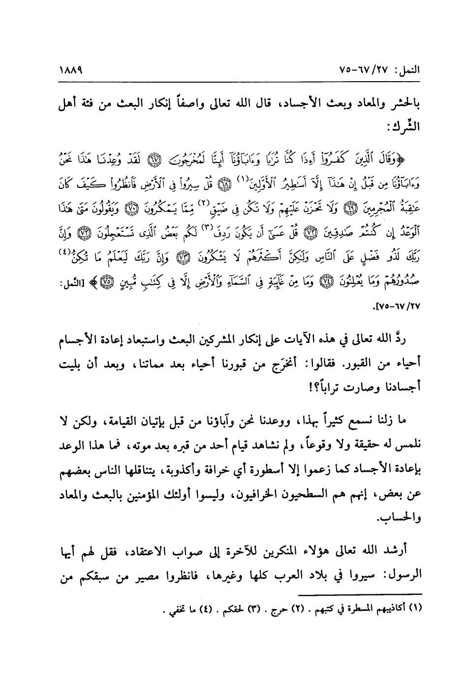 وَقالَ الَّذِينَ كَفَرُوا أَإِذا كُنَّا تُراباً وَآباؤُنا أَإِنَّا لَمُخْرَجُونَ (67) لَقَدْ وُعِدْنا هذا نَحْنُ وَآباؤُنا مِنْ قَبْلُ إِنْ هذا إِلاَّ أَساطِيرُ الْأَوَّلِينَ (68) قُلْ سِيرُوا فِي الْأَرْضِ فَانْظُرُوا كَيْفَ كانَ عاقِبَةُ الْمُجْرِمِينَ (69) وَلا تَحْزَنْ عَلَيْهِمْ وَلا تَكُنْ فِي ضَيْقٍ مِمَّا يَمْكُرُونَ (70) وَيَقُولُونَ مَتى هذَا الْوَعْدُ إِنْ كُنْتُمْ صادِقِينَ (71)