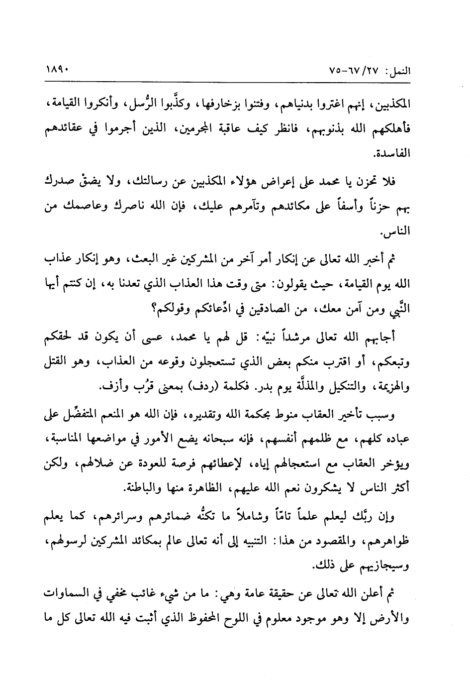 ثم أعلن الله تعالى عن حقيقة عامة وهي: ما من شيء غائب مخفي في السماوات والأرض إلا وهو موجود معلوم في اللوح المحفوظ الذي أثبت فيه الله تعالى كل ما