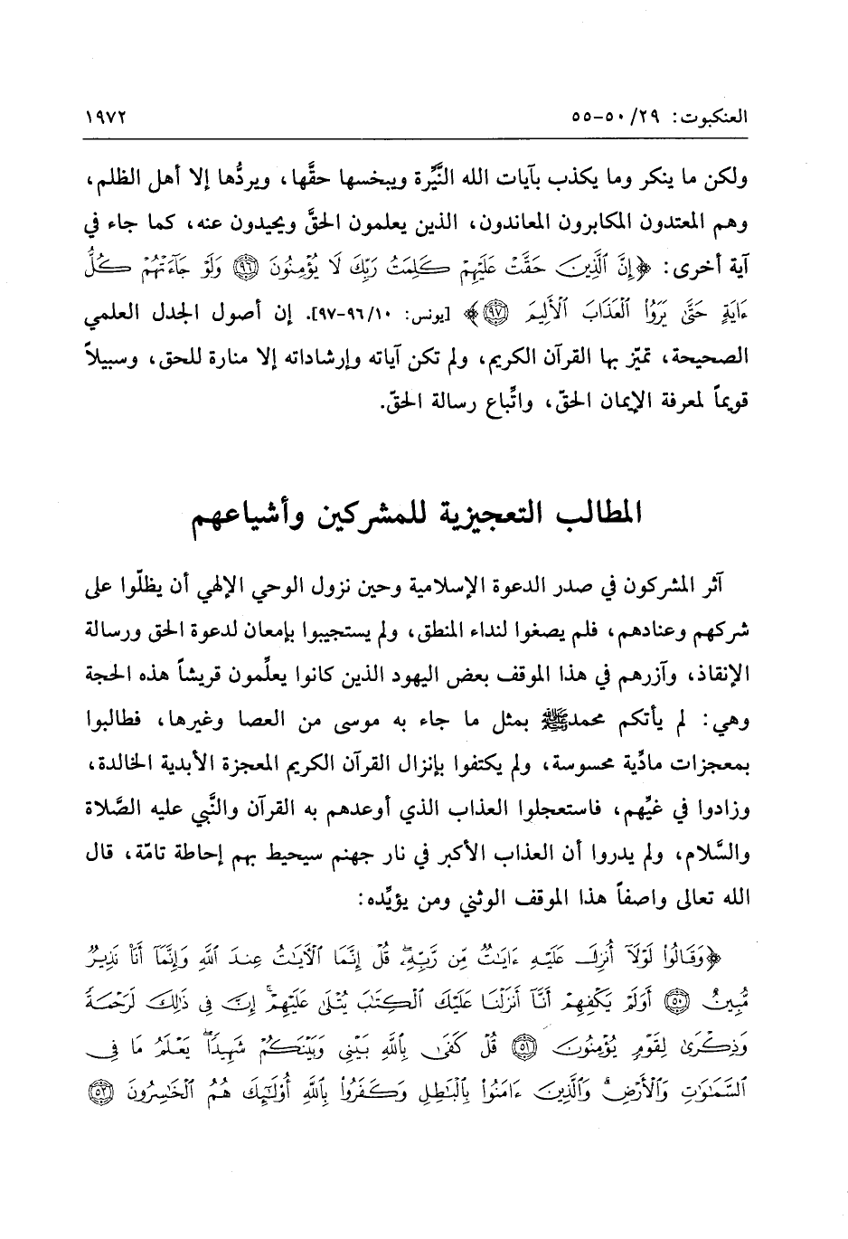 آثر المشركون في صدر الدعوة الإسلامية وحين نزول الوحي الإلهي أن يظلّوا على شركهم وعنادهم، فلم يصغوا لنداء المنطق، ولم يستجيبوا بإمعان لدعوة الحق ورسالة الإنقاذ، وآزرهم في هذا الموقف بعض اليهود الذين كانوا يعلّمون قريشا هذه الحجة وهي: لم يأتكم محمد صلّى الله عليه وسلم بمثل ما جاء به موسى من العصا وغيرها، فطالبوا بمعجزات مادّية محسوسة، ولم يكتفوا بإنزال القرآن الكريم المعجزة الأبدية الخالدة، وزادوا في غيّهم، فاستعجلوا العذاب الذي أوعدهم به القرآن والنّبي عليه الصّلاة والسّلام، ولم يدروا أن العذاب الأكبر في نار جهنم سيحيط بهم إحاطة تامّة، قال الله تعالى واصفا هذا الموقف الوثني ومن يؤيّده: