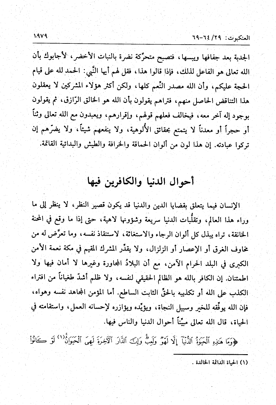 وَما هذِهِ الْحَياةُ الدُّنْيا إِلاَّ لَهْوٌ وَلَعِبٌ وَإِنَّ الدَّارَ الْآخِرَةَ لَهِيَ الْحَيَوانُ لَوْ كانُوا يَعْلَمُونَ (64) فَإِذا رَكِبُوا فِي الْفُلْكِ دَعَوُا اللَّهَ مُخْلِصِينَ لَهُ الدِّينَ فَلَمَّا نَجَّاهُمْ إِلَى الْبَرِّ إِذا هُمْ يُشْرِكُونَ (65) لِيَكْفُرُوا بِما آتَيْناهُمْ وَلِيَتَمَتَّعُوا فَسَوْفَ يَعْلَمُونَ (66) أَوَلَمْ يَرَوْا أَنَّا جَعَلْنا حَرَماً آمِناً وَيُتَخَطَّفُ النَّاسُ مِنْ حَوْلِهِمْ أَفَبِالْباطِلِ يُؤْمِنُونَ وَبِنِعْمَةِ اللَّهِ يَكْفُرُونَ (67) وَمَنْ أَظْلَمُ مِمَّنِ افْتَرى عَلَى اللَّهِ كَذِباً أَوْ كَذَّبَ بِالْحَقِّ لَمَّا جاءَهُ أَلَيْسَ فِي جَهَنَّمَ مَثْوىً لِلْكافِرِينَ (68)