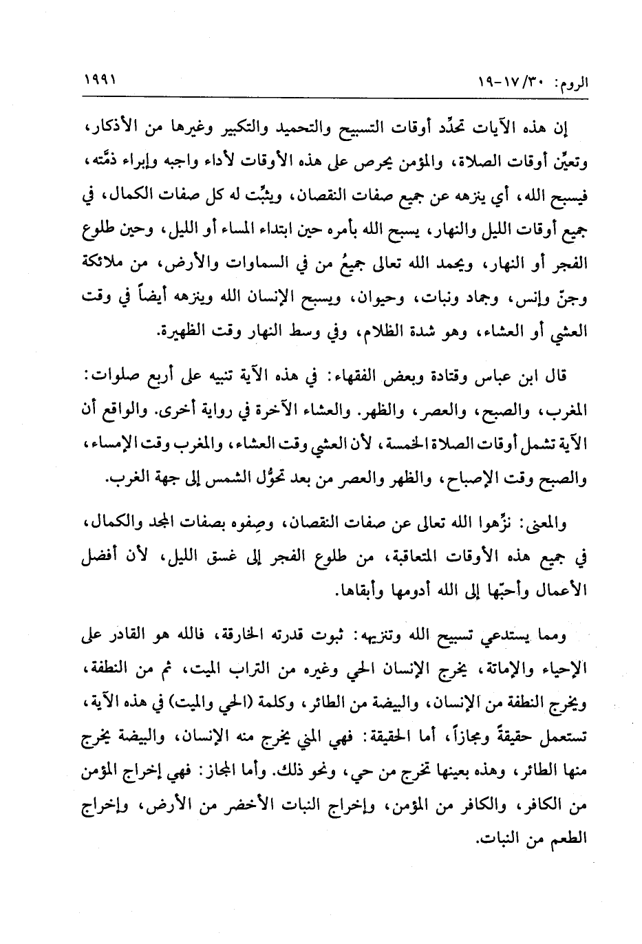 إن هذه الآيات تحدّد أوقات التسبيح والتحميد والتكبير وغيرها من الأذكار، وتعيّن أوقات الصلاة، والمؤمن يحرص على هذه الأوقات لأداء واجبه وإبراء ذمّته، فيسبح الله، أي ينزهه عن جميع صفات النقصان، ويثبّت له كل صفات الكمال، في جميع أوقات الليل والنهار، يسبح الله بأمره حين ابتداء المساء أو الليل، وحين طلوع الفجر أو النهار، ويحمد الله تعالى جميع من في السماوات والأرض، من ملائكة وجنّ وإنس، وجماد ونبات، وحيوان، ويسبح الإنسان الله وينزهه أيضا في وقت العشي أو العشاء، وهو شدة الظلام، وفي وسط النهار وقت الظهيرة.