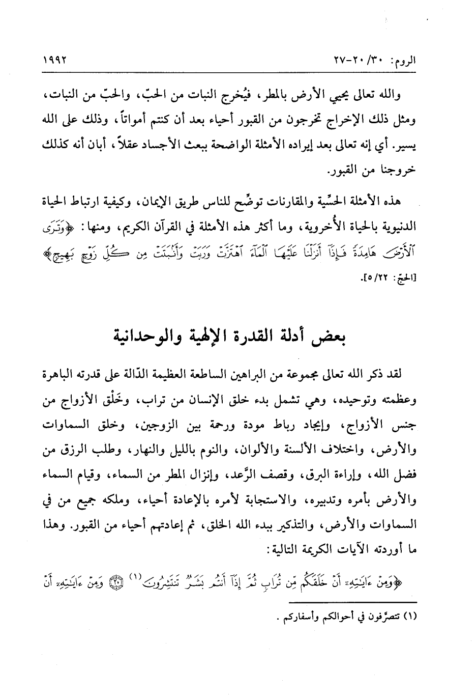 وَمِنْ آياتِهِ أَنْ تَقُومَ السَّماءُ وَالْأَرْضُ بِأَمْرِهِ ثُمَّ إِذا دَعاكُمْ دَعْوَةً مِنَ الْأَرْضِ إِذا أَنْتُمْ تَخْرُجُونَ (25) وَلَهُ مَنْ فِي السَّماواتِ وَالْأَرْضِ كُلٌّ لَهُ قانِتُونَ (26) وَهُوَ الَّذِي يَبْدَؤُا الْخَلْقَ ثُمَّ يُعِيدُهُ وَهُوَ أَهْوَنُ عَلَيْهِ وَلَهُ الْمَثَلُ الْأَعْلى فِي السَّماواتِ وَالْأَرْضِ وَهُوَ الْعَزِيزُ الْحَكِيمُ (27)