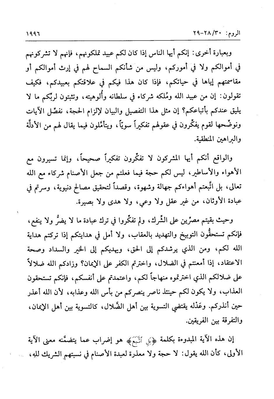إن هذه الآية المبدوءة بكلمة بَلِ اتَّبَعَ هو إضراب عما يتضمّنه معنى الآية الأولى، كأن الله يقول: لا حجة ولا معذرة لعبدة الأصنام في نسبتهم الشريك لله،